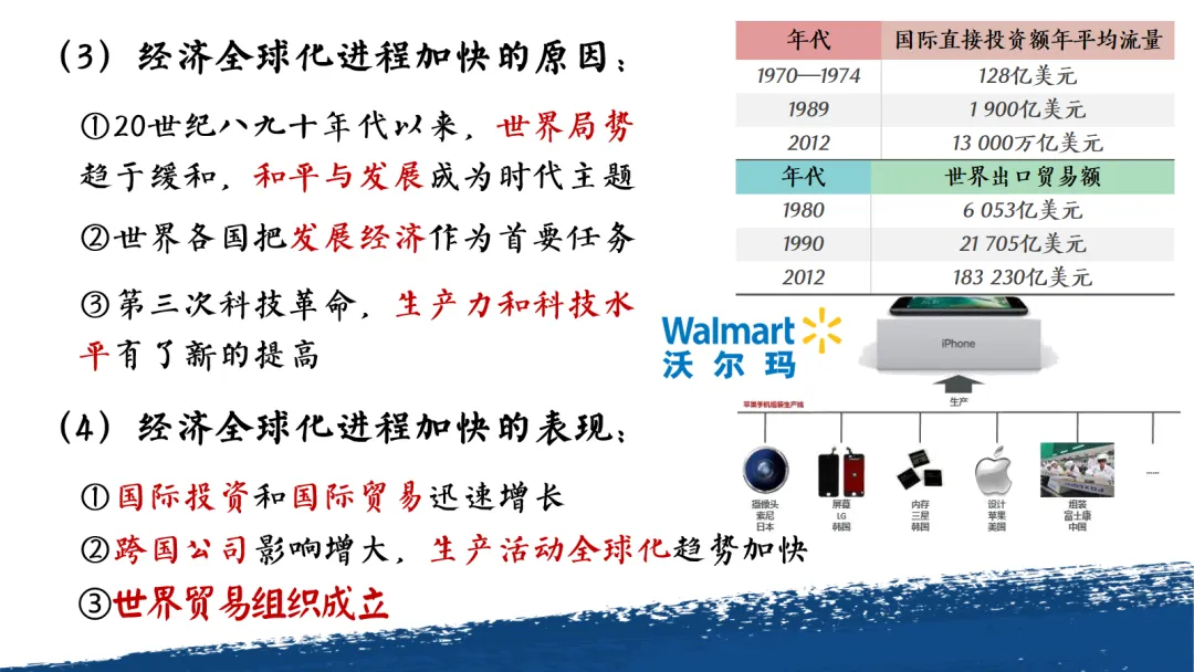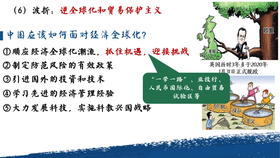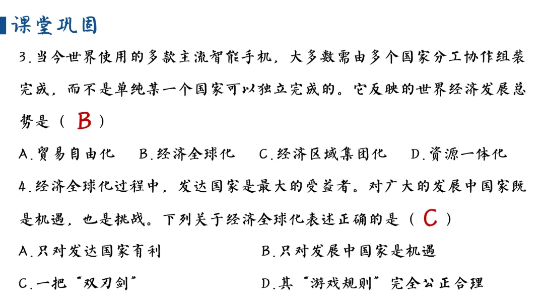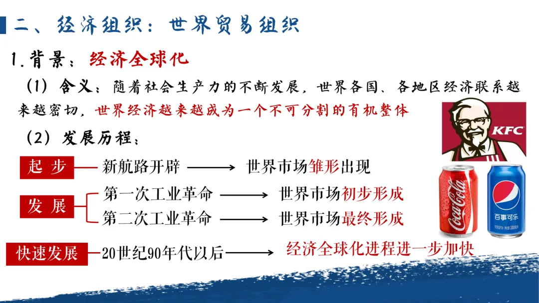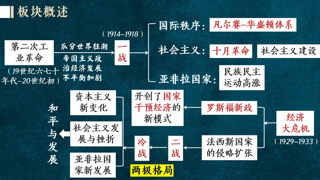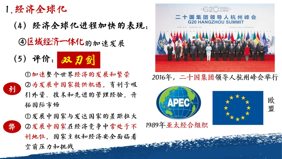 最后一个单元的主题叫做走向和平发展的世界。反映的是苏联解体两极格局结束以后的世界状况。我们用一二四来概况这个单元需要掌握的内容,一指的是一个时代主题,叫做和平与发展。二指的是两个国际组织,分别是联合国和世界贸易组织。四指的是四大发展趋势,包括政治多极化,经济全球化,文化多样化和全球信息化,这几个化里面最重要的就是政治多极化和经济全球化。