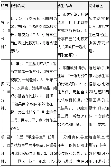 逻辑推理:能通过观察、重叠等方式比较两个物体的长短,初步形成“长短相对” 的思维意识。