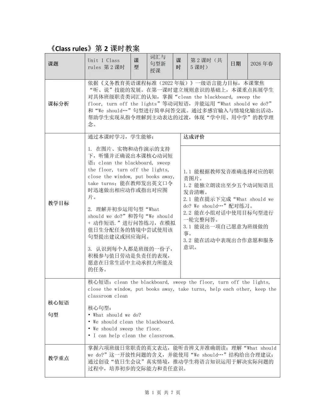 26春人教PEP四年级英语下册Unit 1 Class rules 基础练习卷共6页(含答案解析)