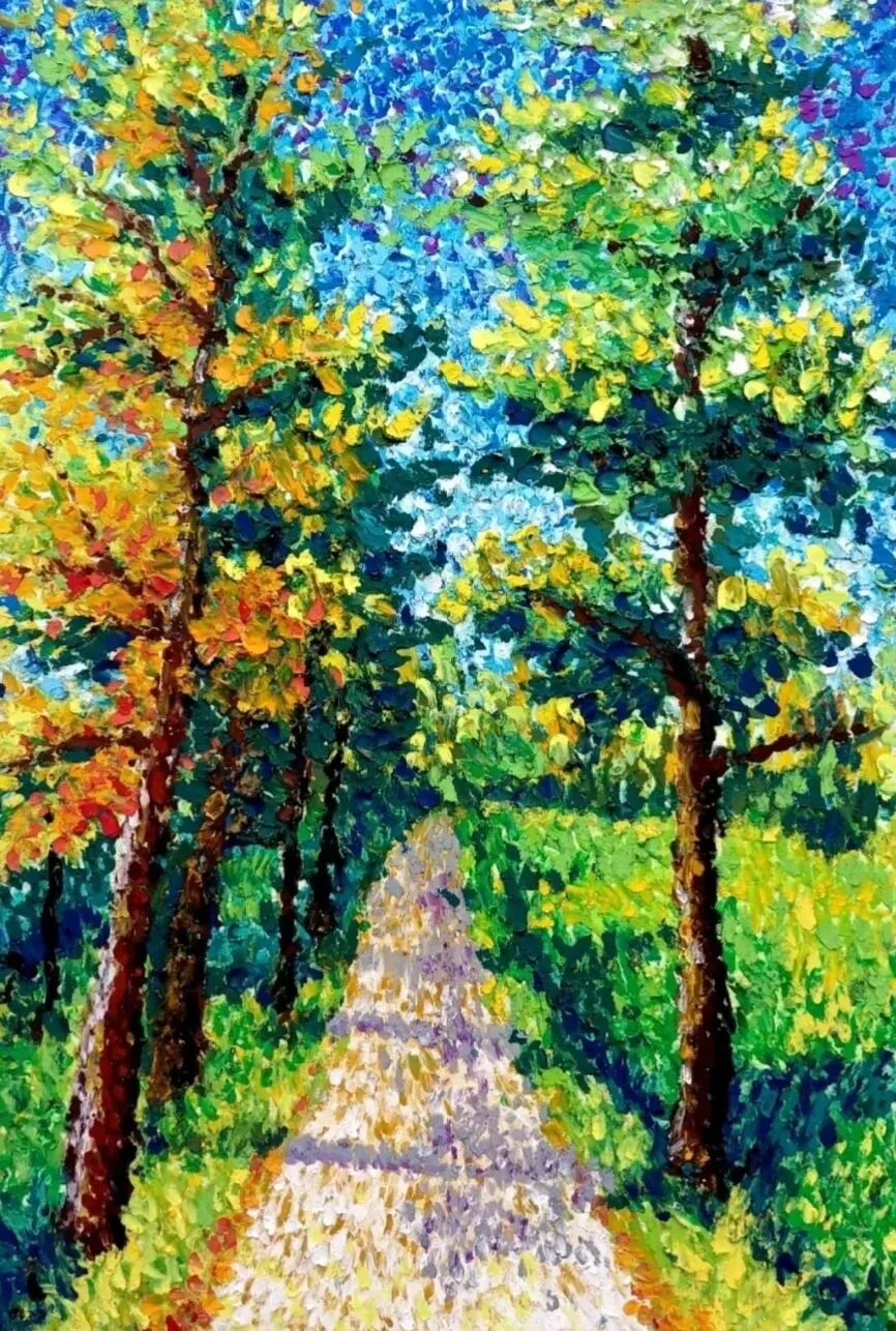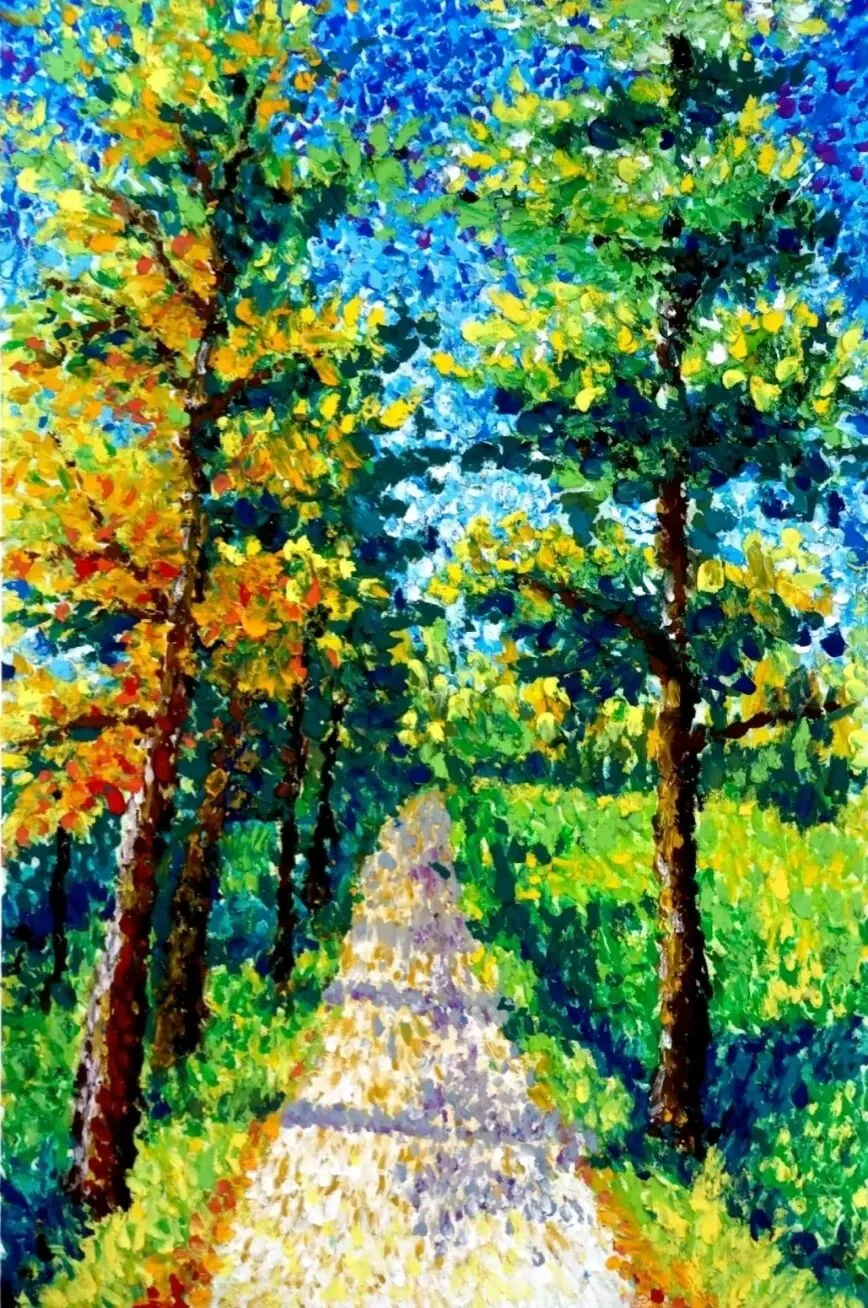 2.掌握点彩核心技巧:用不同大小、疏密的色点,画出林间小路的纵深感、树木的层次和光影感。