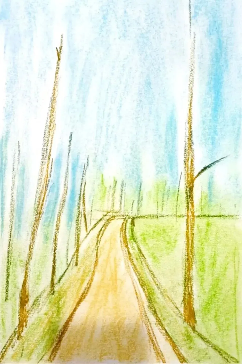 1️⃣线稿打底:用铅笔轻轻勾出林间小路(近宽远窄)、树木(近粗远细),定好“舞台”,不用画细节。
