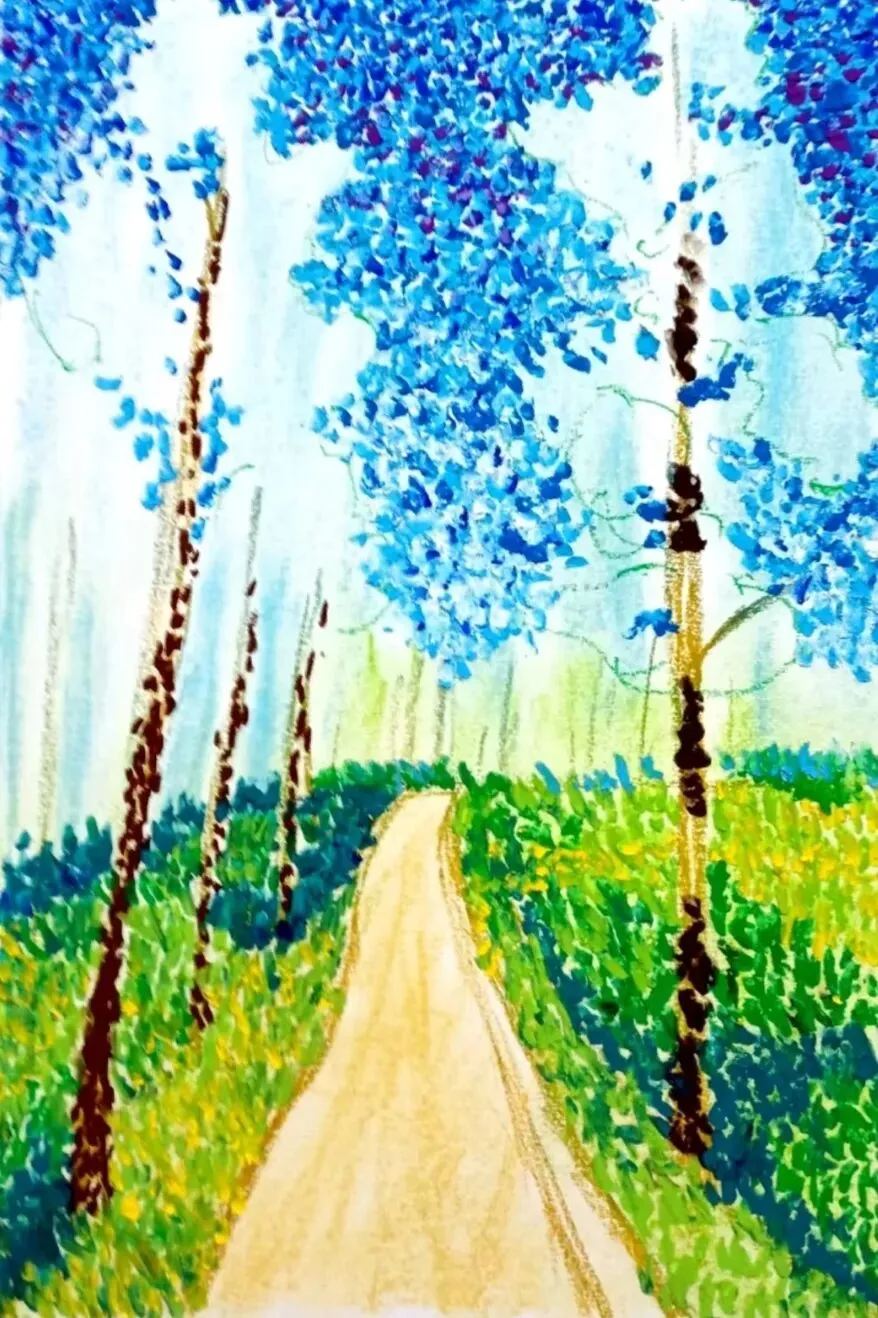 2.用点彩技法画出林间小路的纵深感(近大远小)和树木的色彩变化。