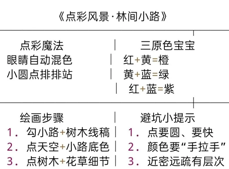 1.点的时候要“快准狠”,别拖成小尾巴,要圆滚滚像小弹珠。2.别让一种颜色“垄断”一块地方,让红、黄、蓝的小点做好朋友,混出来的颜色才梦幻!1️⃣构图起稿:用铅笔轻轻勾出小路和树木,老师巡视时可以调侃:“谁的小路能把我带到冰淇淋店?记得画近宽远窄哦,不然走两步就撞树啦!”2️⃣底色点绘:先点天空和小路,从大面积开始,让孩子感受“铺点”的节奏,鼓励他们:“咱们的小路是用阳光点点铺成的,越多越闪亮!”3️⃣主体刻画:重点点绘树木,近处的树点得密一点、颜色深一点,远处的树点得疏一点、颜色浅一点,体现“近大远小”。4️⃣细节丰富:添加路边花草、光斑,甚至可以点几只小蝴蝶,让画面活起来。1️⃣对没耐心的孩子:“咱们这是在攒星星,攒够了就能召唤春天啦!”2️⃣对颜色乱点的孩子:“让红点点和黄点点做好朋友,别让它们在树上打架哦!”3️⃣鼓励创新:“可以给小路点上粉点点,让春天更甜!”1. 作品展示:把所有作品贴在展示墙,举办“林间小路星光展”。“找一找,哪条小路最像能通往魔法森林?”“谁的树叶点得最像被阳光吻过?”【让孩子用“我最喜欢XX的画,因为它看起来XX”的句式分享】表扬“点得最整齐”“色彩最梦幻”“创意最特别”的作品,调侃道:“咱们班已经诞生了好几位‘点彩小大师’,以后可以去给修拉大师当徒弟啦!”提醒:点彩画的魅力就是“慢工出细活”,多练几次,你们的点点会更有魔法! 1.课后挑战:回家用点彩法画一片树叶或一朵小花,试试用不同颜色的点混合出更多“眼睛里的颜色”。2.知识拓展:告诉孩子,除了点彩,还有泼彩、刮画等很多绘画魔法,下次课我们继续解锁新技能!
