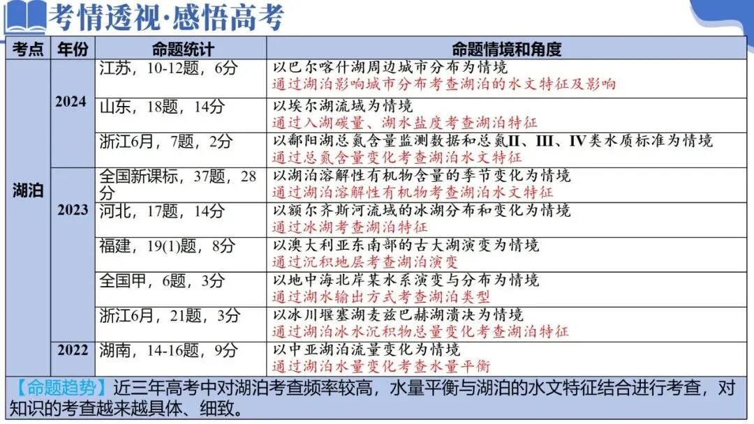 2023 | 全国新课标,37题,28分 | 以湖泊溶解性有机物含量的季节变化为情境 通过湖泊溶解性有机物考查湖泊水文特征 |
