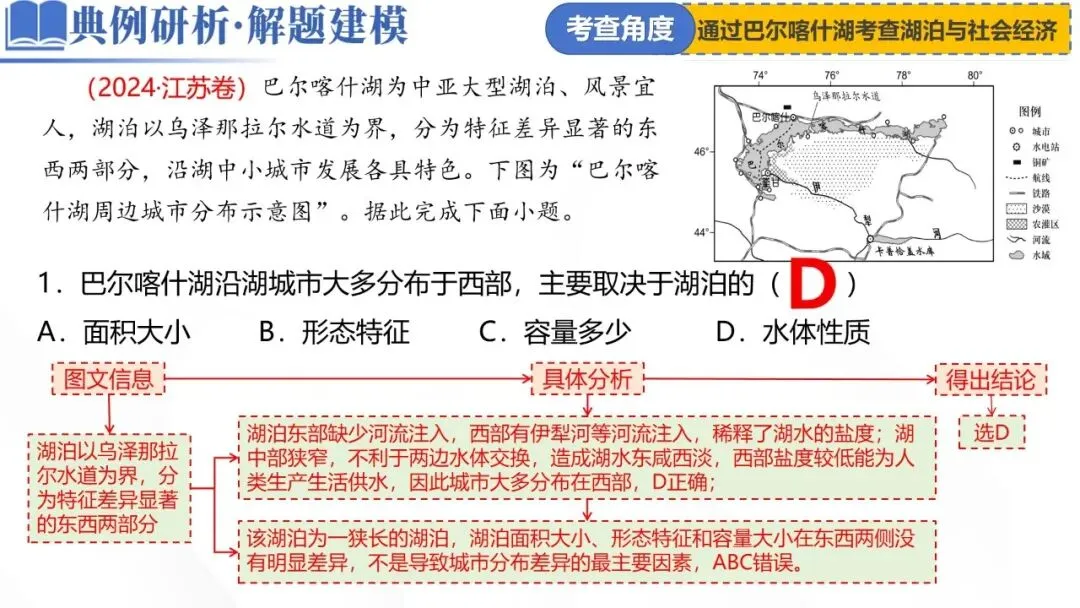 湖泊 | 2024 | 江苏,10-12题,6分 | 以巴尔喀什湖周边城市分布为情境 通过湖泊影响城市分布考查湖泊的水文特征及影响 |