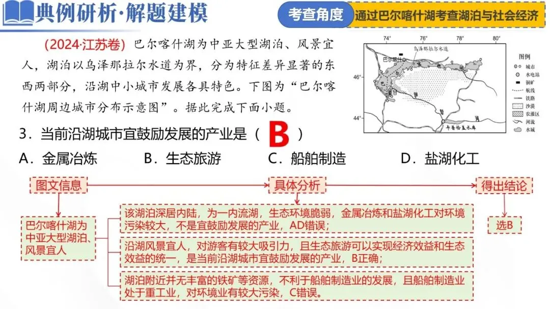 2022 | 江苏,10-12题,6分 | 以巴尔喀什湖周边城市分布为情境 通过湖泊影响城市分布考查湖泊的水文特征及影响 |