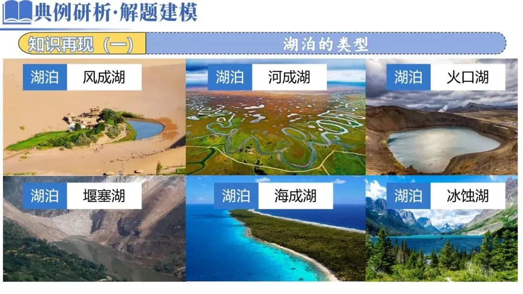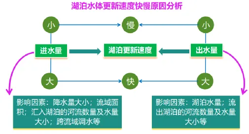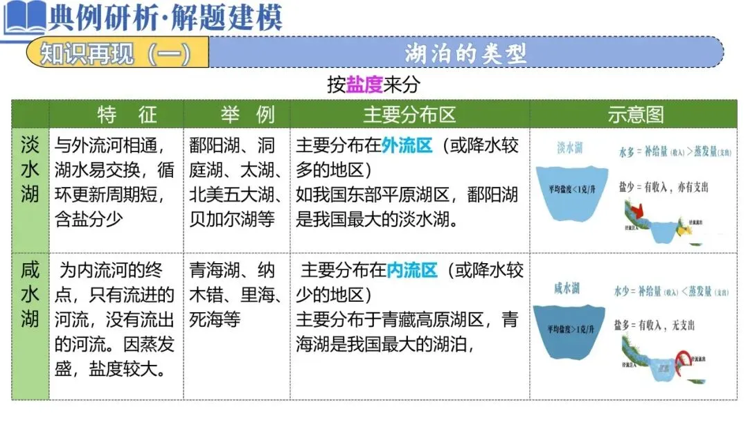 淡水湖 | 与外流河相通,湖水易交换,循环更新周期短,含盐分少 | 鄱阳湖、洞庭湖、太湖、北美五大湖、贝加尔湖等 | 主要分布在外流区(或降水较多的地区) 如我国东部平原湖区,鄱阳湖是我国最大的淡水湖。 | |