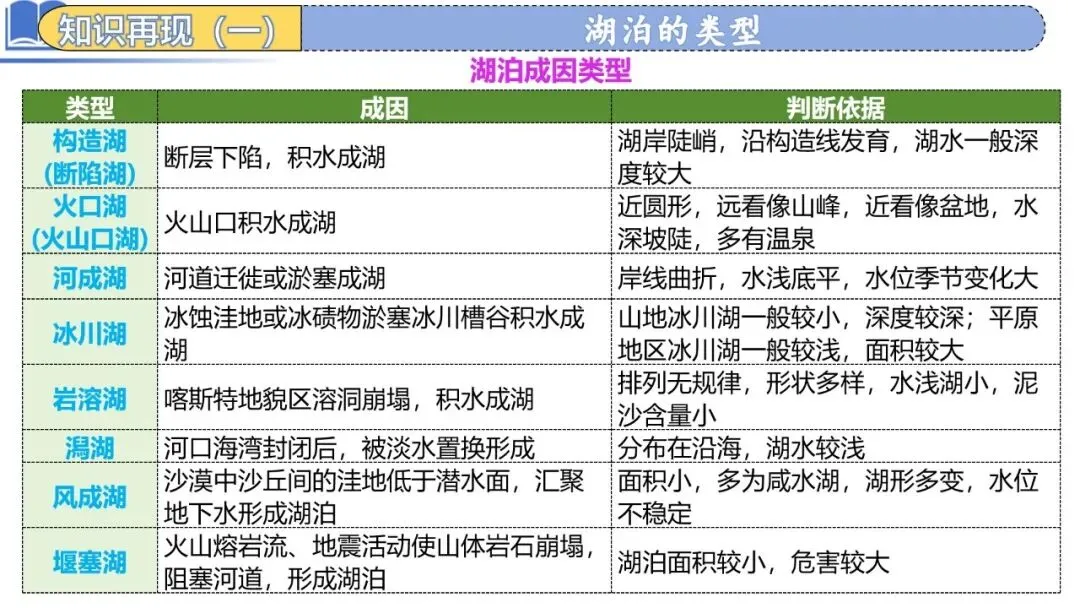 咸水湖 | 为内流河的终点,只有流进的河流,没有流出的河流。因蒸发盛,盐度较大。 | 青海湖、纳木错、里海、死海等 | 主要分布在内流区(或降水较少的地区) 主要分布于青藏高原湖区,青海湖是我国最大的湖泊, |