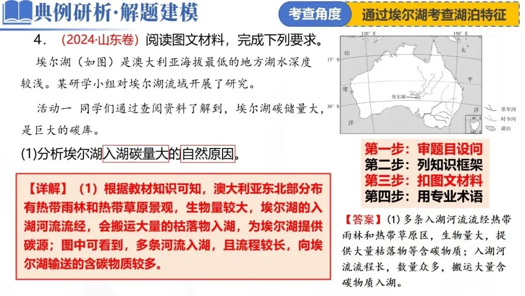 【详解】(1)根据教材知识可知,澳大利亚东北部分布有热带雨林和热带草原景观,生物量较大,埃尔湖的入湖河流流经,会搬运大量的枯落物入湖,为埃尔湖提供碳源;图中可看到,多条河流入湖,且流程较长,向埃尔湖输送的含碳物质较多。