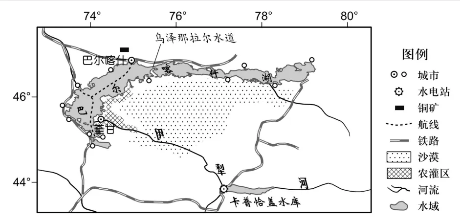 (2024·江苏卷)巴尔喀什湖为中亚大型湖泊、风景宜人,湖泊以乌泽那拉尔水道为界,分为特征差异显著的东西两部分,沿湖中小城市发展各具特色。下图为“巴尔喀什湖周边城市分布示意图”。据此完成下面小题。