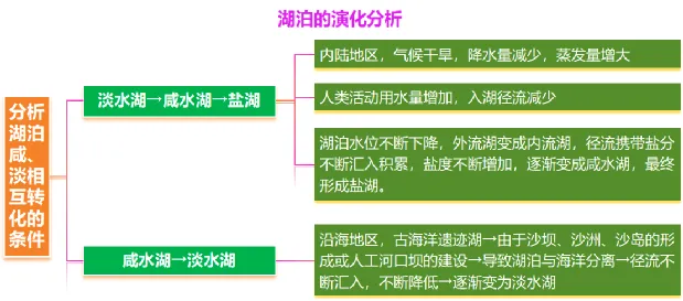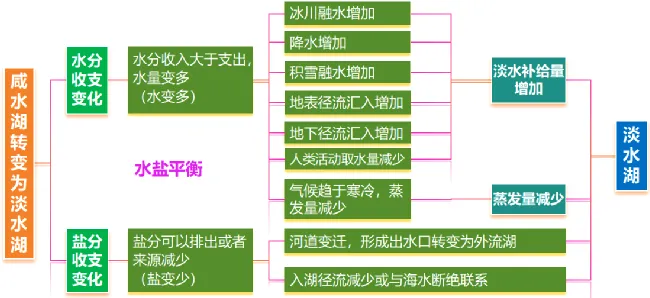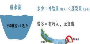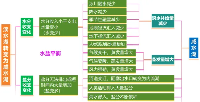 蒸发量大于淡水补给量 | 为内流湖,无径流排出盐分,淡水径流不断补给量带入盐分、不断累积、形成咸水湖 |