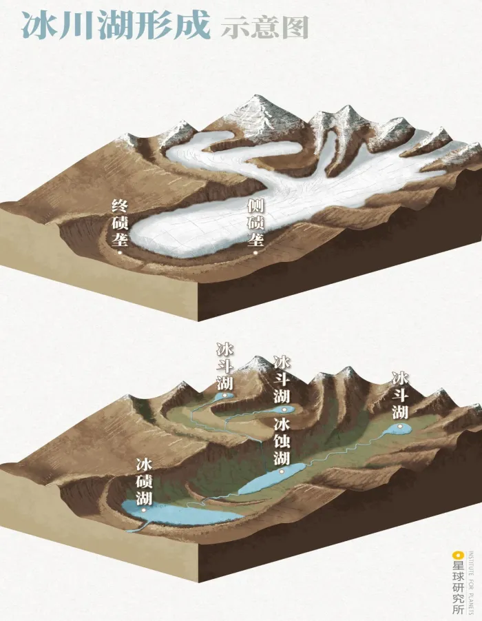 冰川湖 | 冰蚀洼地或冰碛物淤塞冰川槽谷积水成湖 | 山地冰川湖一般较小,深度较深;平原地区冰川湖一般较浅,面积较大 |