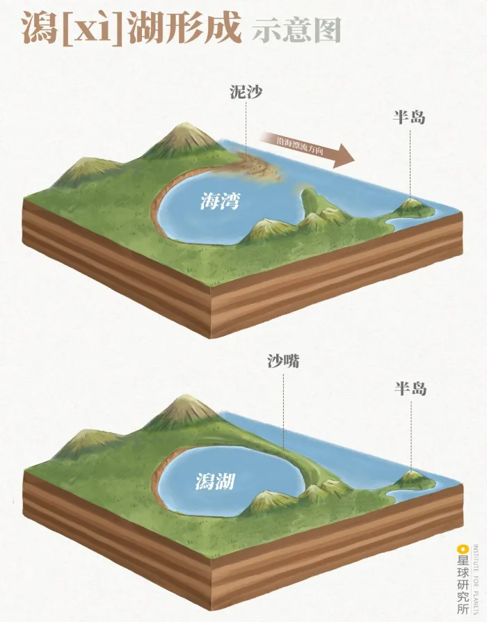 潟湖 | 河口海湾封闭后,被淡水置换形成 | 分布在沿海,湖水较浅 |