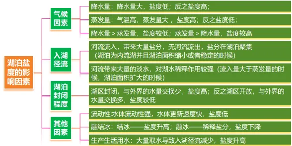 ②主要特征:封闭、蒸发量大、盐度大、面积小、降水少、湖水较浅、地势较平坦等。