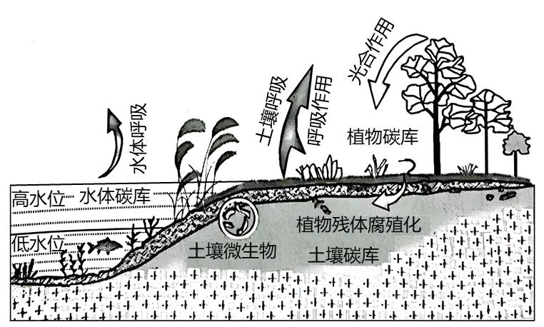 (2023·浙江6月选考)在“双碳”目标背景下,湖泊湿地的生态修复是个重要的固碳举措。下图为湖泊湿地碳循环示意图。完成下面小题。