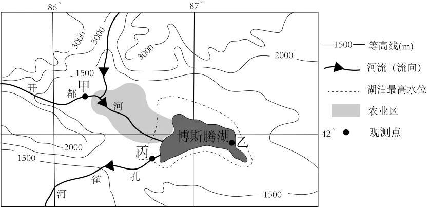 博斯腾湖是新疆最大的淡水湖。但近年来,受农业灌溉用水增加等因素影响,盐度上升,目前属于微咸湖。湖区周围生长着茂密的芦苇。芦苇是一种多生长于低湿或浅水中的高大禾草。下图为博斯腾湖及其周边地区示意图。完成下面小题。
