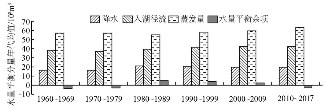 伊塞克湖位于吉尔吉斯斯坦天山北坡的封闭性山间盆地中,属内陆咸水湖,许多河水在未汇入该湖之前就被用于灌溉等生产活动,但河流不是其唯一的补给来源。下图示意1960—2017年伊塞克湖水量平衡年代变化(水量平衡余项是入湖水量与出湖水量之差)。据此完成下面小题。