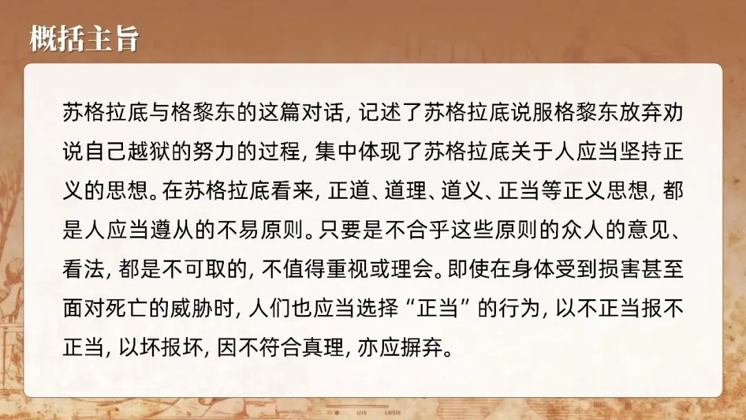 本文选自柏拉图《理想国》,记录苏格拉底与友人关于正义的哲学对话。面对死刑判决,苏格拉底拒绝越狱逃亡,认为遵守城邦法律即是正义,即使判决不公也不可因个人恩怨而破坏法律尊严。文章通过层层追问与逻辑推演,展现了苏格拉底"未经审视的人生不值得过"的哲学精神,以及为信仰殉道、坚守原则的人格力量,是西方伦理学的经典文献。