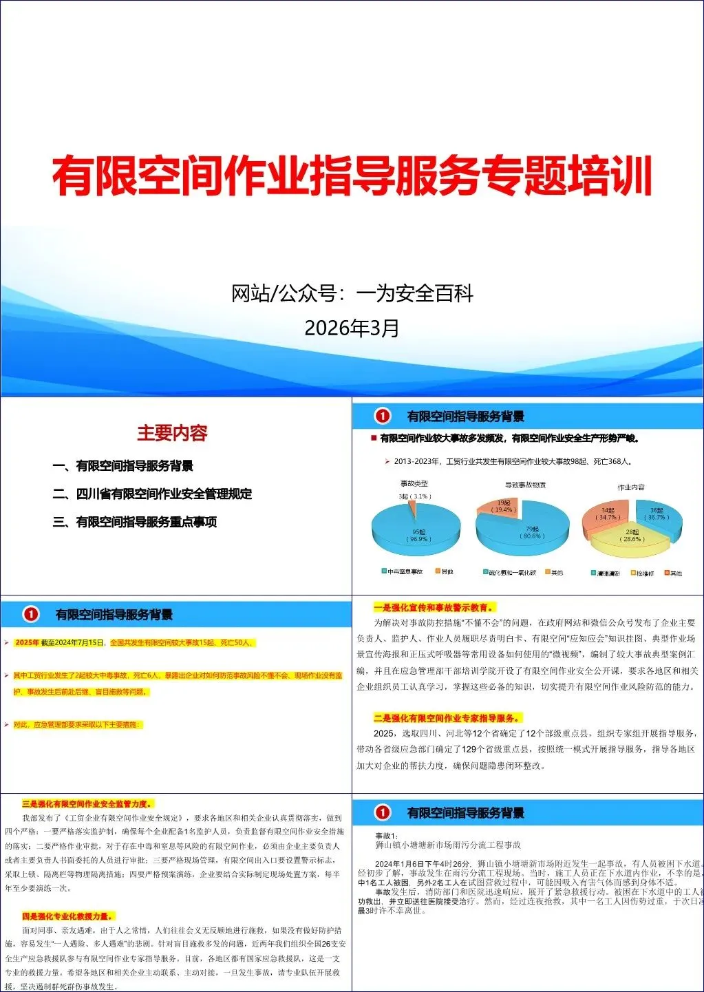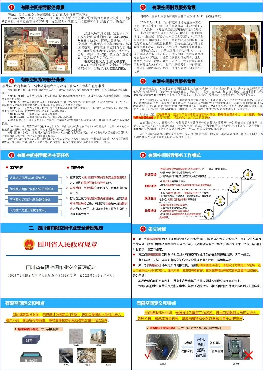 该培训课件旨在提升企业及监管人员对有限空间作业安全的认知与管理能力,以遏制频发的较大事故。文档首先通过多起真实、惨痛的事故案例(如成都彭州“4·13”七人死亡事故)揭示了当前严峻的安全形势,指出事故主因在于企业“不懂不会”、现场缺乏有效监护、以及事故发生后普遍存在的盲目施救行为。