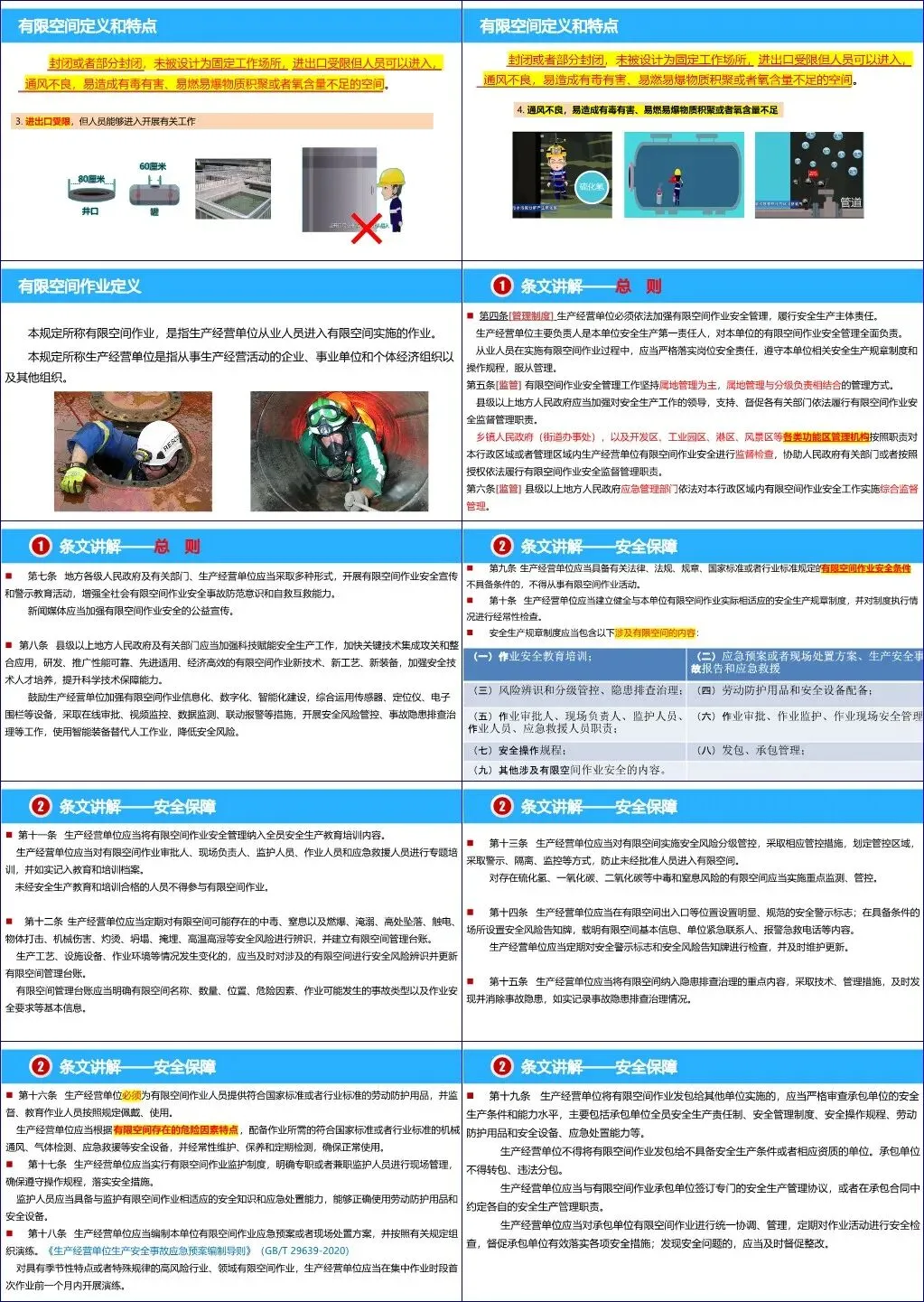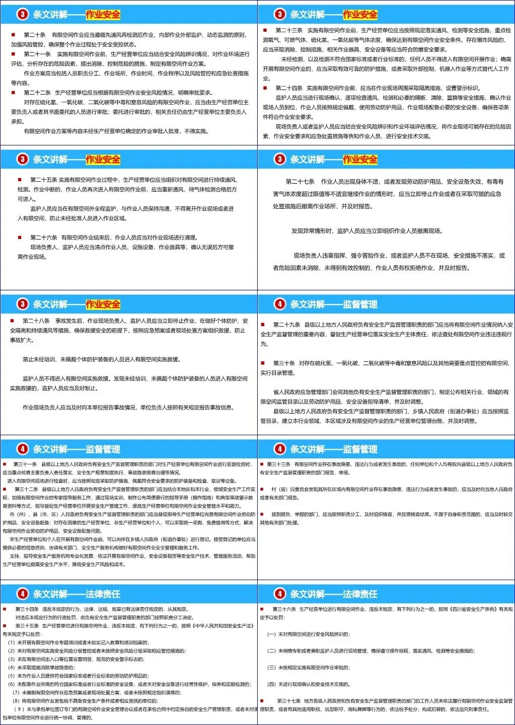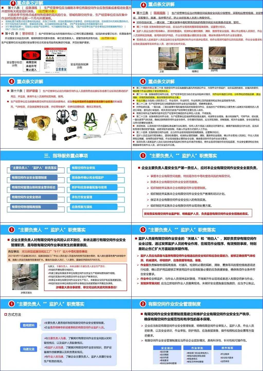 课件的核心部分详细解读了《四川省有限空间作业安全管理规定》,明确了生产经营单位的主体责任和主要负责人的第一责任人地位。规定要求企业必须建立健全安全管理制度,对有限空间进行全面辨识并建立管理台账,在出入口设置醒目的安全警示标志,并对作业人员进行专题安全培训。