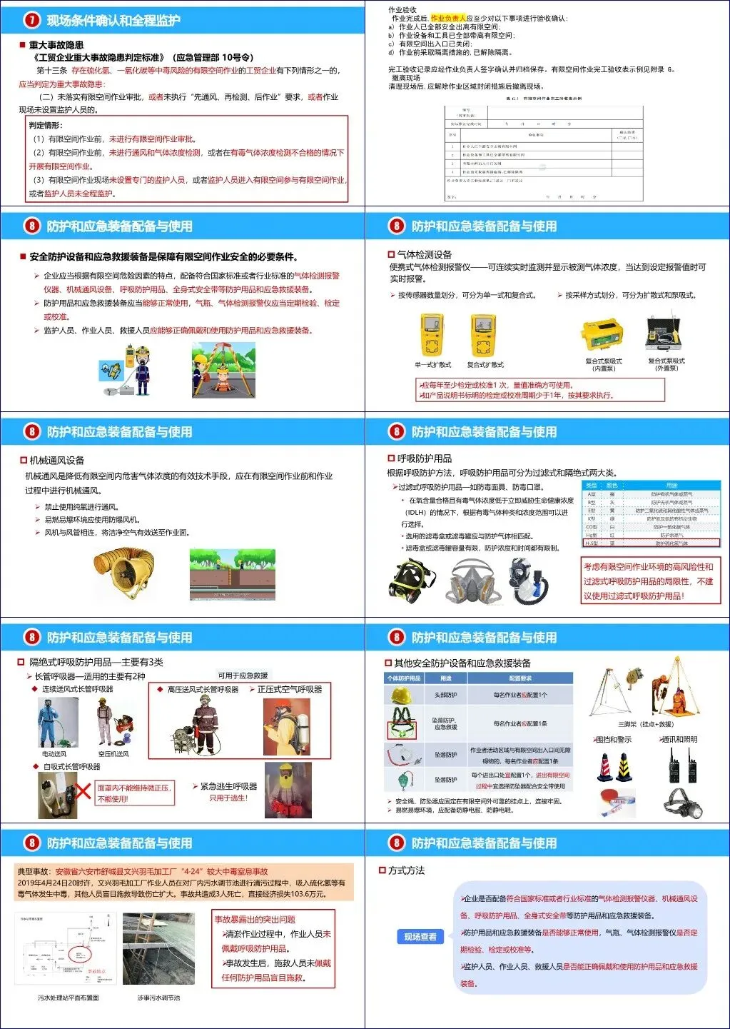 在具体作业环节,文档强调了必须遵循“先通风、再检测、后作业”的铁律。对于存在中毒窒息风险的作业,必须由企业主要负责人或其书面委托人进行审批。作业过程中,监护人员必须在外部全程监护,严禁进入施救。同时,企业必须配备符合标准的防护和应急装备,如气体检测仪、机械通风设备和正压式空气呼吸器等,并确保相关人员能正确使用。