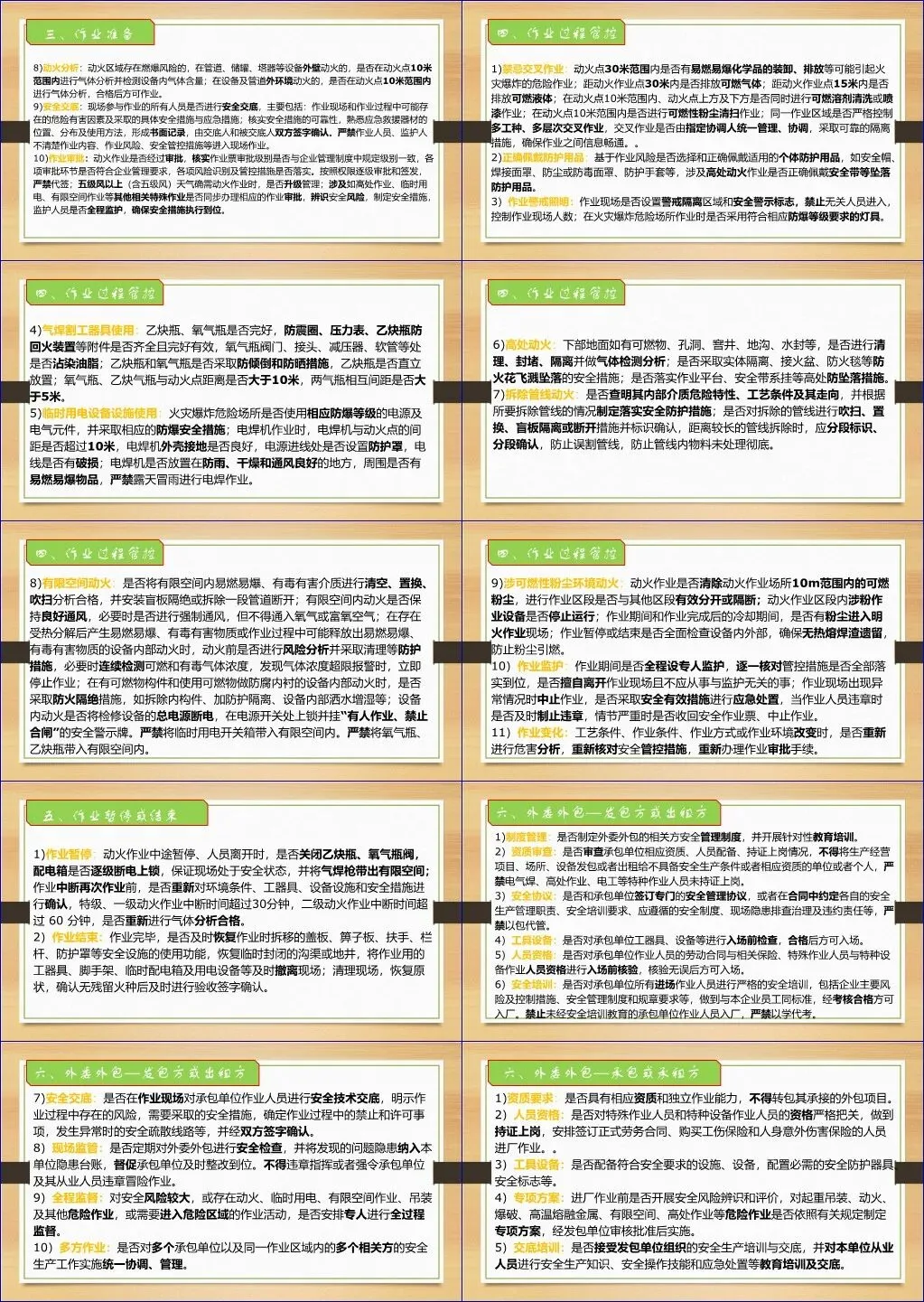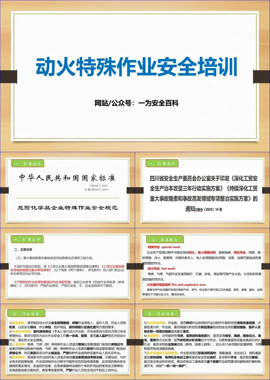 该文档《动火特殊作业安全培训课件》系统阐述了危险化学品及工贸企业中动火作业的安全管理要求,依据国家标准《GB30871-2022 危险化学品企业特殊作业安全规范》,全面覆盖作业前准备、作业过程管控、暂停与结束、外委外包管理等关键环节。内容强调:必须建立健全安全管理制度,严格作业审批流程,落实风险辨识与能量隔离措施;特种作业人员须持证上岗,并接受充分的安全教育培训;作业现场需配备合格消防器材、规范使用气焊割工具(如氧气瓶、乙炔瓶间距≥5米,距动火点≥10米),严禁交叉作业;在有限空间、高处、可燃粉尘环境等特殊场景下动火,须采取针对性防护与连续气体监测;外委作业时,发包方与承包方均须履行安全管理职责,签订协议、统一协调、全程监督。文档特别指出,习惯性违章(如电焊机未接地、气瓶滚动搬运、现场无灭火器)是重大隐患源头,必须杜绝“三违”行为。最终强调:标准执行的关键在于人的执行力,并以墨菲定律警示——“凡事可能出错,就一定会出错”。
