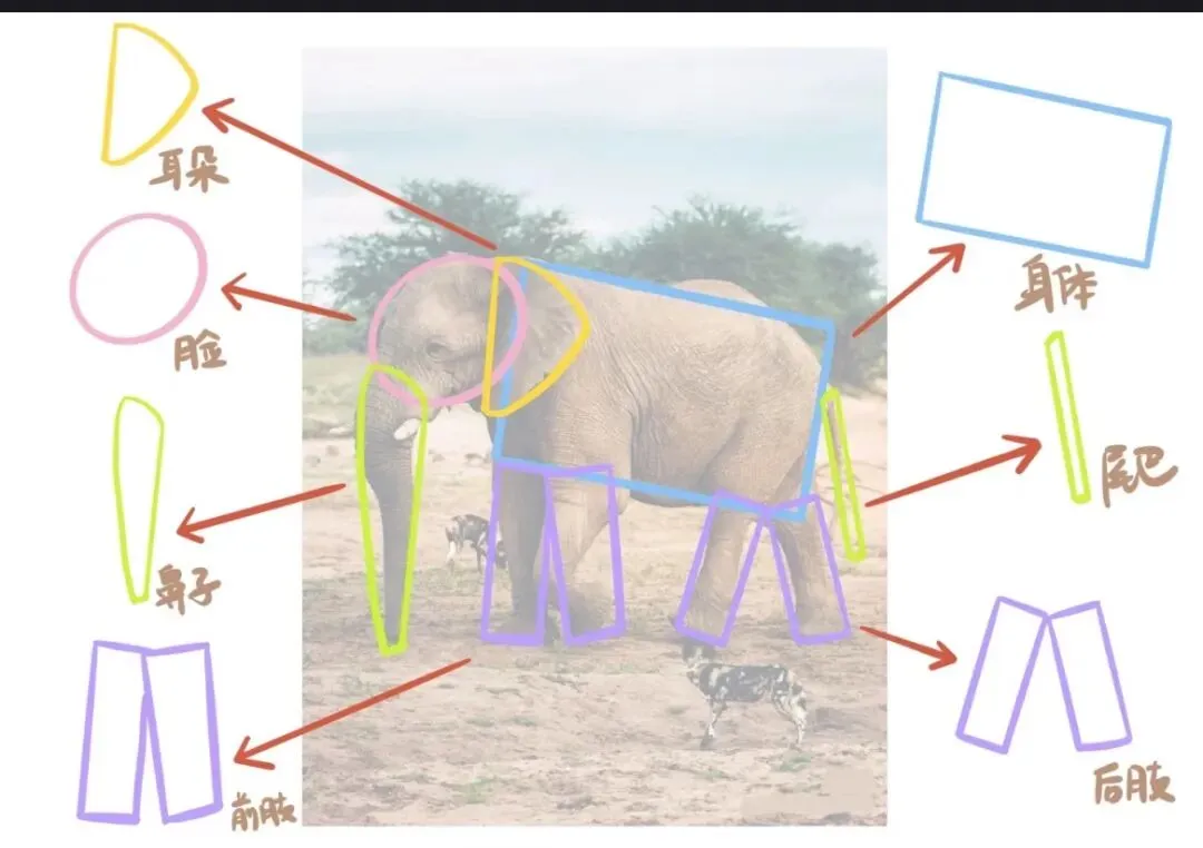 2. 分格子:用直线、曲线、折线,把大象的身体分成大大小小、形状不一的格子,可随意分割,不用追求整齐。