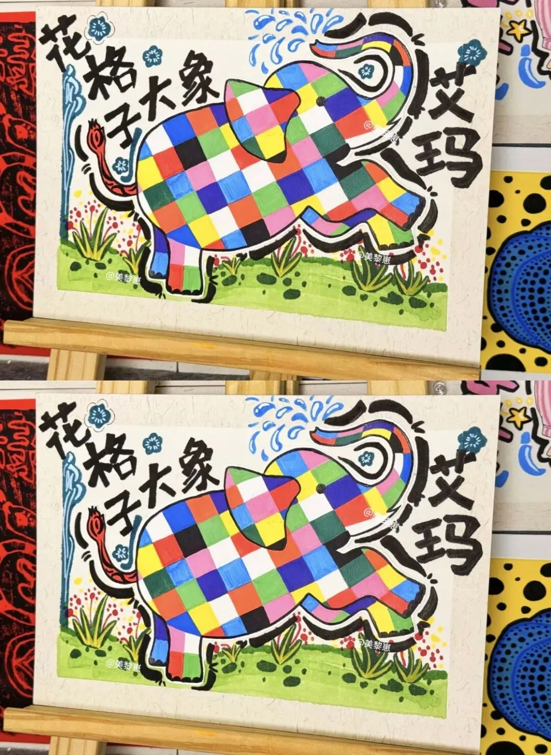 2. 观察花格子特点:展示艾玛的高清图片和花格子示范画,让幼儿仔细观察艾玛身上的图案。引导幼儿发现,艾玛的格子有方形、长方形,颜色丰富多样,红、黄、蓝、绿、紫等色彩交错排列,没有固定规律,既鲜艳又好看。鼓励幼儿说一说自己看到的颜色和格子形状,激发幼儿的色彩感知力。