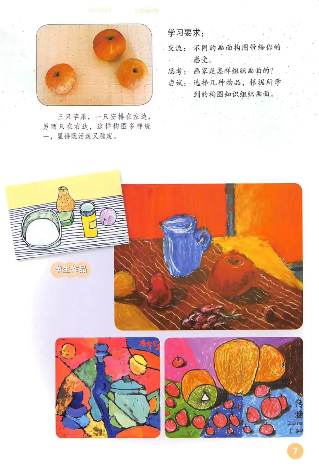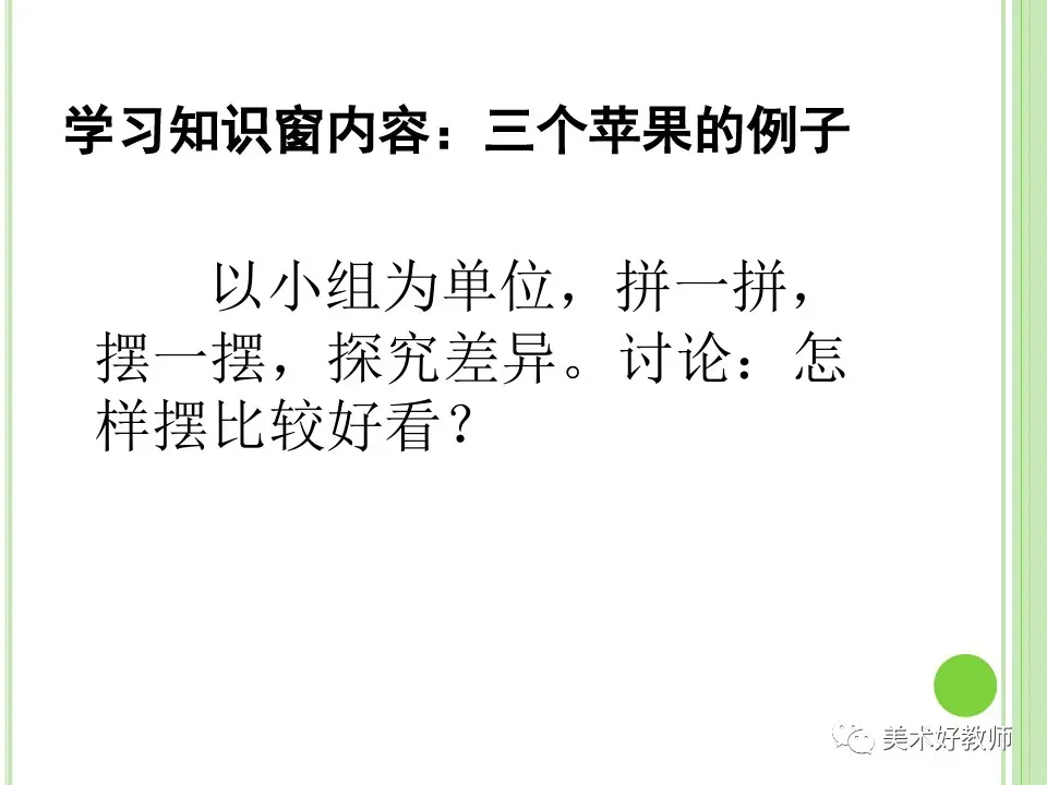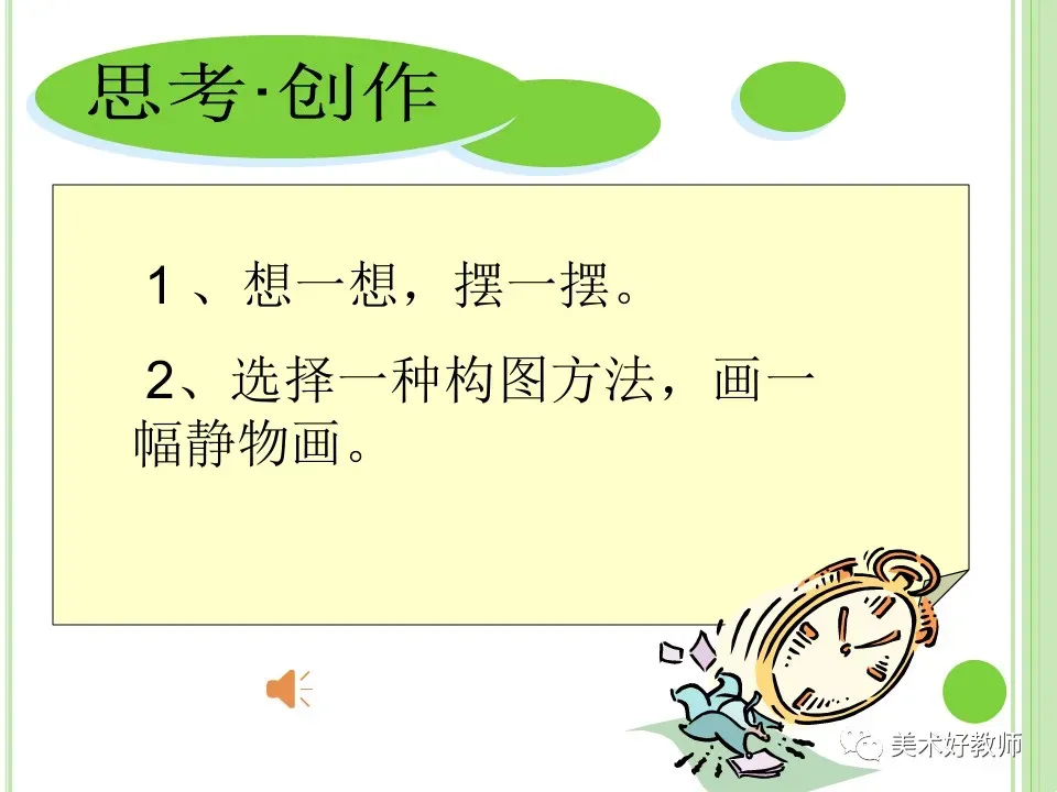 --------------------------------------------------------1、通过教学活动,让学生了解构图的基本知识。了解多样与统一的基本规律。并利用多样与统一的规律,画一组静物。2、通过学习活动,学生初步在学习中体会多样与统一在绘画构图中的作用,尝试自己动手做一个取景框,进行构图训练。并从活动中体会到乐趣。3、培养学生的认真观察事物的习惯,利用视觉感受事物的不同和变化。了解多样与统一的基本规律, 学会运用多样与统一的基本规律进行静物写生。运用多样与统一的基本规律进行静物写生,对不同静物的观察。1、 让学生了解构图的基本知识。了解多样与统一的基本规律。并利用多样与统一的规律,画一组静物。2、通过学习活动,学生初步在学习中体会多样与统一在绘画构图中的作用,尝试自己动手做一个取景框,进行构图训练。并从活动中体会到乐趣。3、培养学生的认真观察事物的习惯,利用视觉感受事物的不同和变化。2、学生活动:把自己准备的实物进行组合(以小组为单位)3、欣赏范画实例:画家是怎样运用多样与统一的基本规律2、让学生把自己准备好的取景框,把要写生的对象观察下来。(3)找出最高点、最低点、左右两侧的界线形成一个三角形多进行观察和静物写生,锻炼认真观察事物的习惯。还可以进行风景写生。1.了解多样与统一的基本规律。并利用多样与统一的规律,画一组静物。2.学生初步在学习中体会多样与统一在绘画构图中的作用,尝试自己动手做一个取景框,进行构图训练。并从活动中体会到乐趣。3、培养学生的认真观察事物的习惯。利用视觉感受事物的不同和变化。1、什么是静物画:静物画是西方绘画中的一个门类。它指以日常生活中无生命的物体为主要描绘对象……也就是说从概念的意义上,西方的静物画与动物画只在极小的范围内有一定的重合现象。师小结:利用线条的长、短、粗、细、曲、直等特点,来描绘写生对象1、多练习线描,在静物写生的基础上,可进行风景写生。锻炼自己仔细观察生活的能力。大家好,今天我说课的内容是人教版小学五年级美术下册第4课《学构图》,我将从教材分析、教学目标、学情分析、教学重难点、教法和学法、教具学具准备、教学过程、板书设计八个方面进行说课。 《学构图》是人教版小学五年级美术下册第4课,属于造型·表现领域。通过赏析绘画作品,初步了解构图的基本概念、形式与法则,发展学生的感知能力以及表达和交流的能力。引导学生尝试运用形式与法规进行构图训练,发展学生的想象力,创造了和知识的迁移能力。引导学生在欣赏中感知构图在美术创作中的重要性,并在体验构图训练的过程中,逐步提升学生的审美情趣。 本课是一节欣赏性和创作性于一体的美术课。根据教材要求,本课用一个课时教学。 根据素质教育的要求、新课改的精神和以上对教材的分析,我确定以下三维教学目标: 1、知识技能目标:通过欣赏和讨论艺术家的作品,了解绘画艺术作品中常见的构图形式。 2、过程方法目标:了解构图在美术设计,创作中的作用,运用形式美的构图法则,完成写生绘画作品。 3、情感态度目标:培养学生敏锐的观察力,感受美术构图学习的乐趣。 五年级学生属于小学高年级阶段,认知能力相对较强,在本册第1课形的魅力和第2课形体的组合学习中,对形的构成有了一定的了解,本节课的设置符合学生的年龄特点和认知水平。 依据美术学科的特点和学生的认知水平,我确定本课的教学 重点是:了解和认识构图的知识,学会利用构图知识组织画面。 依据新课程标准 “以学生为主体”和“充分发挥学生个性” 的理念,我将运用直观教学法、示范教学法、启发教学法。 在学法指导上采用欣赏法、对比法、观察法、讨论法、操作法,充分调动学生的“眼、手、脑”多种感官参与学习,既提高了学生的学习兴趣,也培养了学生的动手能力,使他们充分享受到成功的乐趣。 为了使学生更直观的感受构图的形式美原则在写生中的运用,我准备了以下 教具:多媒体资料、范画、学生作品、四组写生静物等。为了突出本课教学重点,完成教学目标,依据新课程标准,我将从五个环节设计实施本课教学。小结:绘画时根据题材和主题思想的要求,把表现的形象适当地组织起来,构成一个协调的完整的画面,这称为构图。那么,如何把物体组织在画面上才会有美感呢? 首先请3位同学来做一个小游戏,规则是:分别给他们3个苹果,假设让他们把苹果表现在画面上会怎么安排,请同学们把它摆出来。然后让大家讨论谁的摆放看起来最合理,为什么? 经过观察讨论,同学们得出,一号同学和二号同学的作品呈横着或者竖着一字型排开,如果表现在画面上会比较死板。三号同学的作品看起来会比较舒服。我会及时给出问题:为什么三号同学的作品会看起来比较舒服呢?是因为他的摆法疏密得当,错落有致。 本环节通过游戏,使学生认识到画面构图要遵循一定的基本规律,引出课题。(本环节让学生走近艺术大师的作品,感受构图的形式美原则,并通过回答问题,对构图的形式美原则有了初步了解。) 先请同学们观摩别班同学的静物写生作品,并提议用和他们比赛的方法,激发学生的创作灵感和创作激情。 让同学们分为四个小组,摆放四组静物,有暖水壶、玻璃茶杯、三个苹果、一个盘子。利用构图的形式美原则,进行静