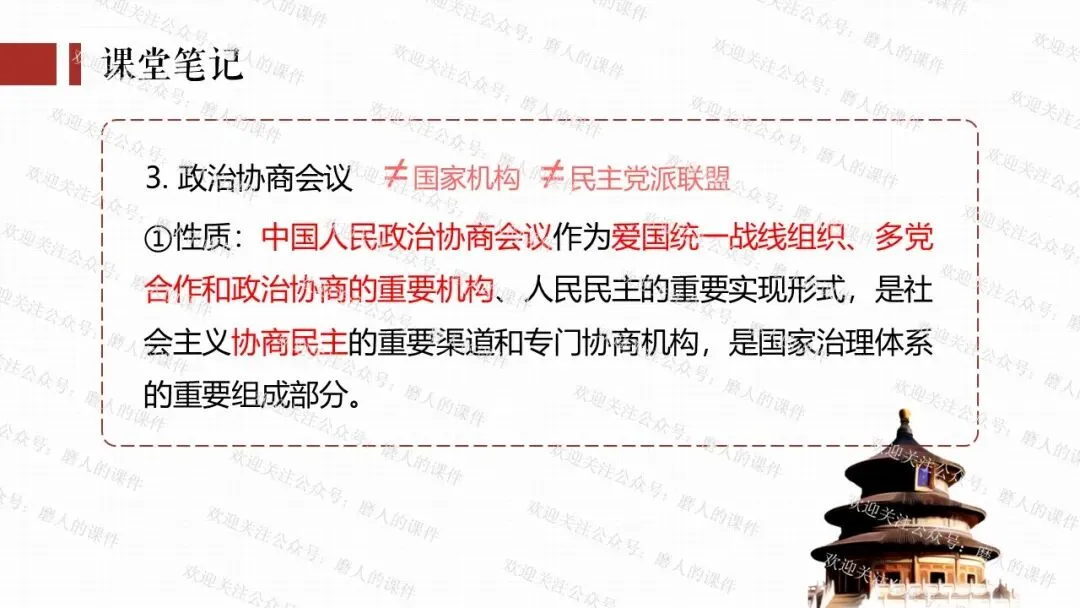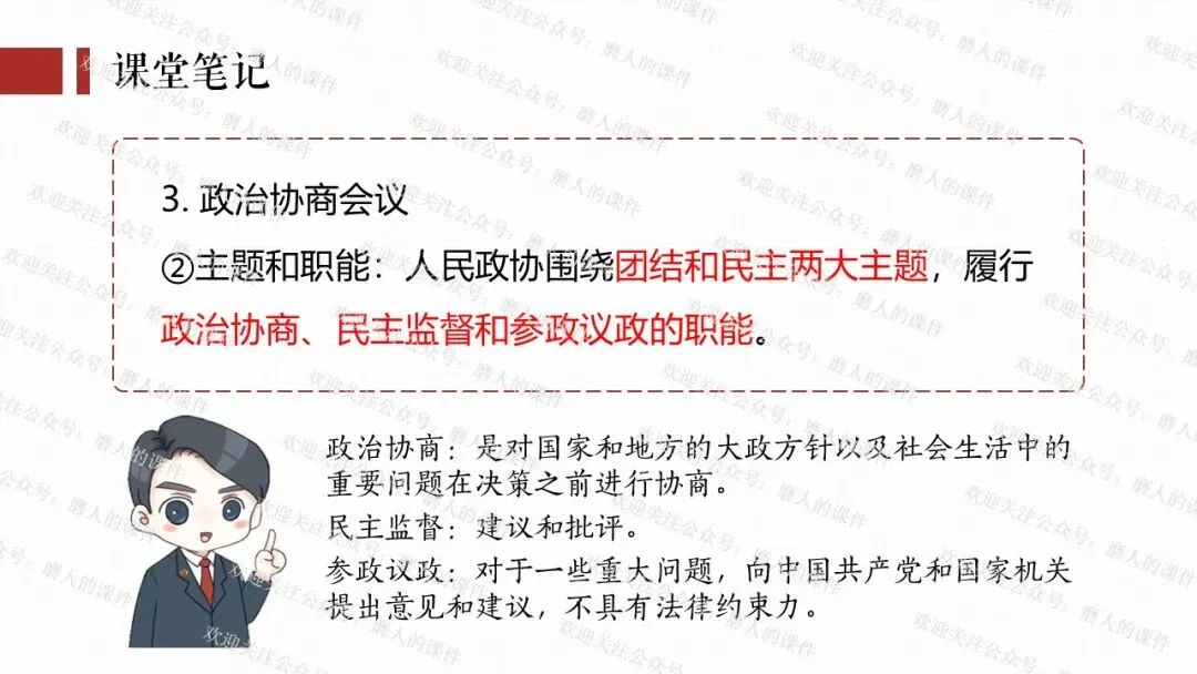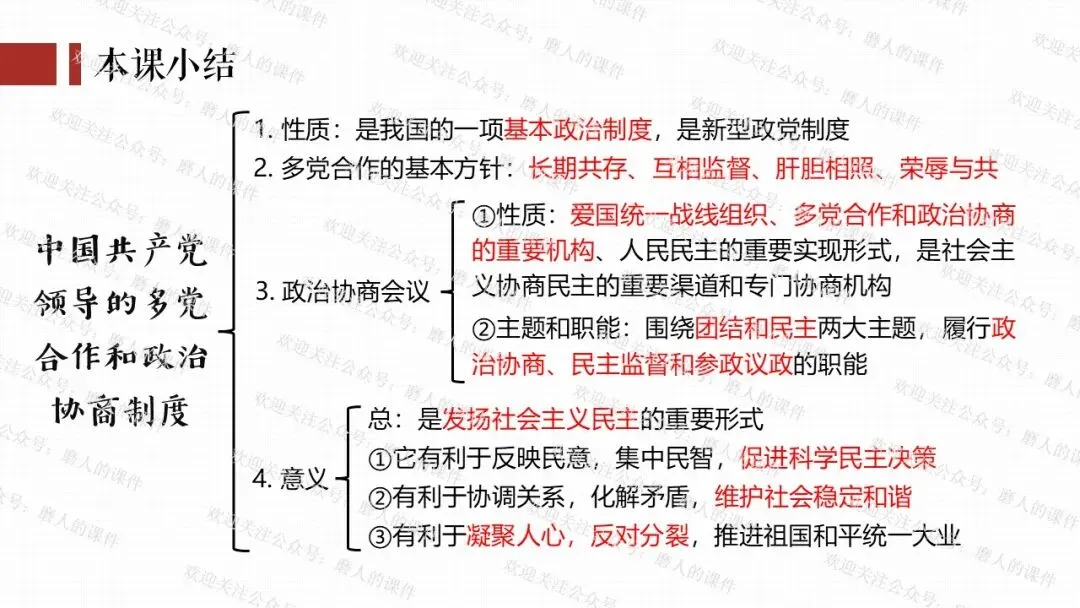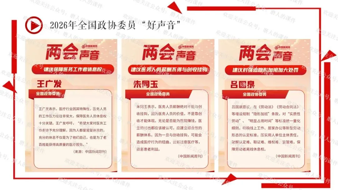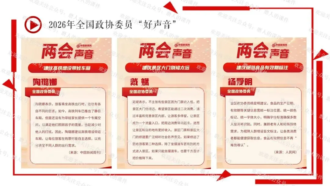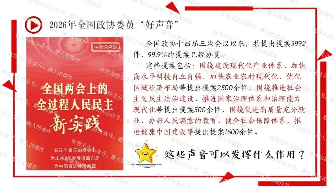 我以2026年全国“两会”新闻贯穿全课。通过中国共产党与民主党派的历史渊源学习制度的性质和多党合作的基本方针;通过了解我国民主党派概况、界别等知识,理解政治协商会议;再通过全国政协委员“好声音”,学习制度的意义,坚定制度自信。最后呈现本课的知识框架。课件逻辑清晰,素材丰富,兼具知识讲授和价值引导。