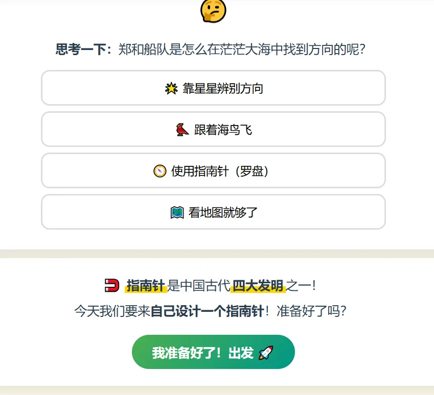 他这个里面内置的每一个步骤,比如开始是先介绍郑和下西洋,然后又开始考虑到材料的各种优缺点,又讲到三种放置的办法。他基本都是按照教材教参的逻辑来的,我只是把他们整理成了一个统一的文件,放在这个里面,直接拿这一个就可以去上课,其实跟那种用PPT上课的都差不多,因为这节课确实很难去把它具体演示出来,也没有说要做一个什么实验的东西,下节课才是具体的实践,这节课主题就是要一个串联起整个逻辑,在串联的过程当中营造一个情境化,情景化的东西让学生们能够更加有兴趣去听课。