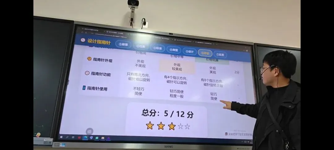 第六课设计指南针,我发现这节课的内容有点多,需要孩子们理解的逻辑顺序有点复杂,看着对于成年人来说比较简单,但是他需要一步步的思考哪些材料怎么使用,哪些材料易获得,哪个地方更加应该优化,哪一种方法可能有优点或者缺点等。我看了网上其他老师制作的课件,基本也都是比较枯燥的,就是很难去把这一课讲的生动有趣,除了老师个人的语言要有趣一点。其实你说要在这一节课上得很有实操性,有点难。