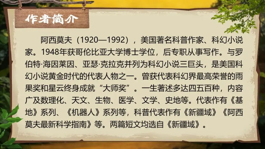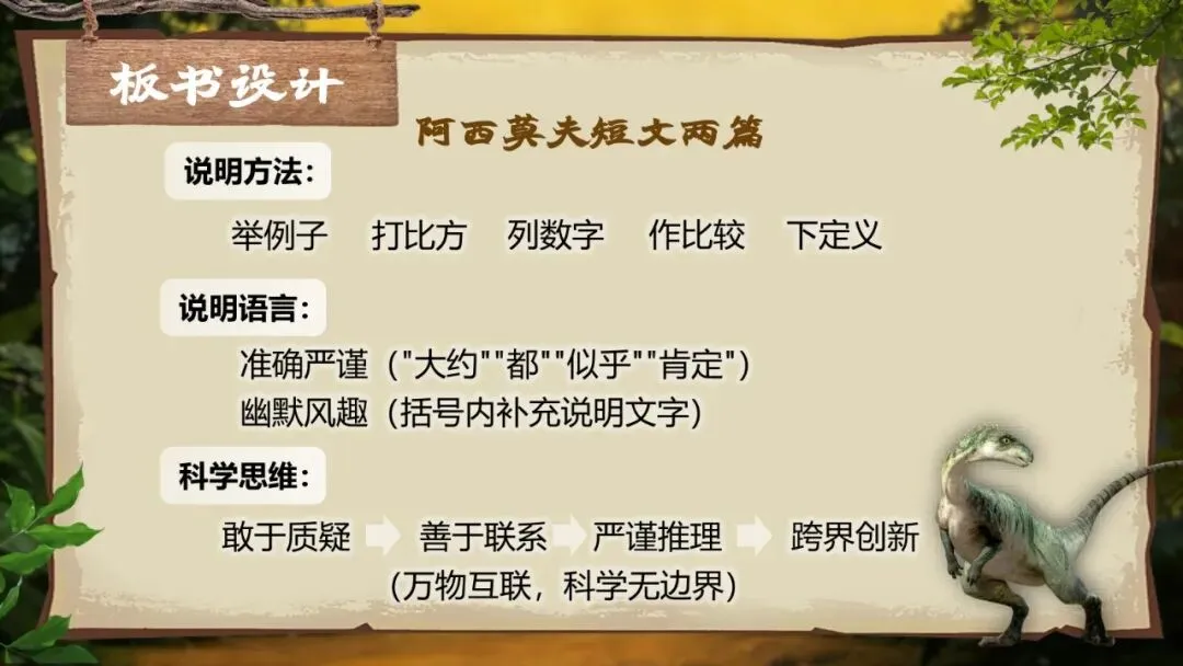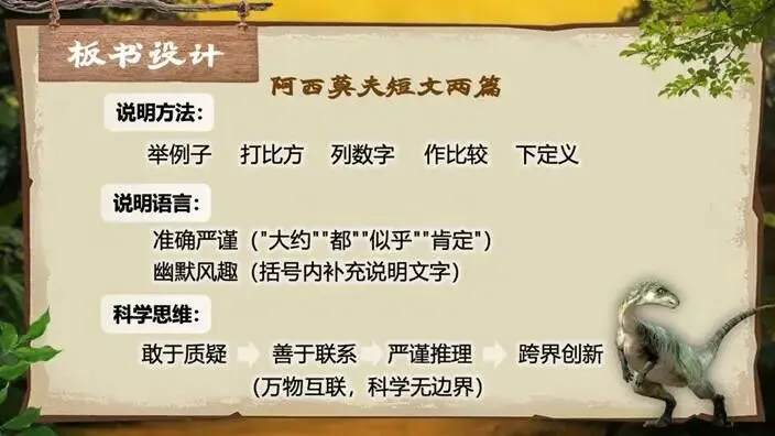 上节课,我们跟随阿西莫夫完成了两次精彩的“科学侦探”,理清了两篇文章的逻辑链条。今天,我们再深入一步——去欣赏这位“科学侦探”的侦查方式:他用了哪些说明方法?又是用怎样的语言风格来呈现推理过程的?同时,我们还要思考:这种“不同领域互联”的科学思维,对我们有什么启发?