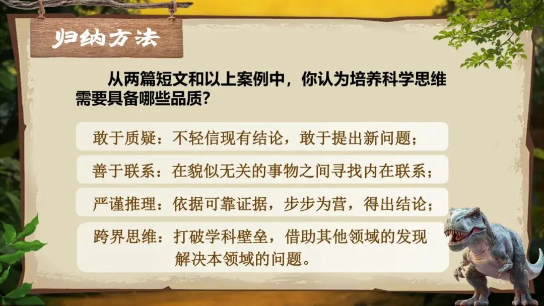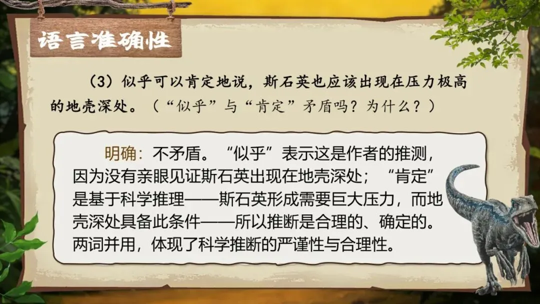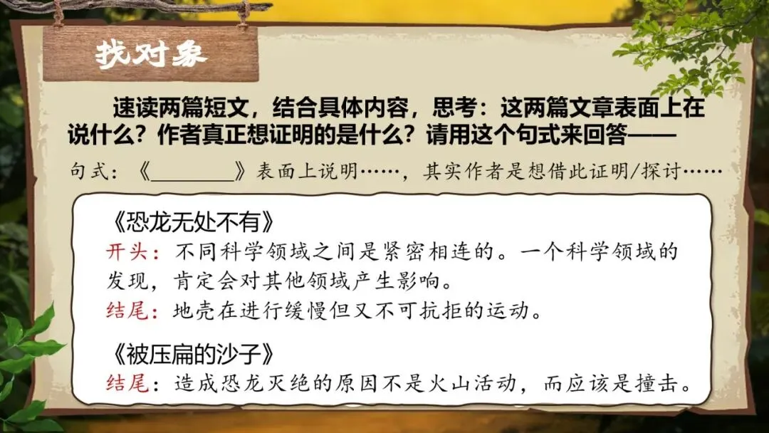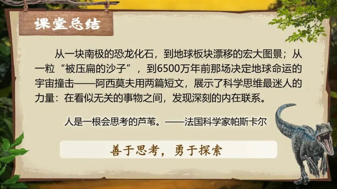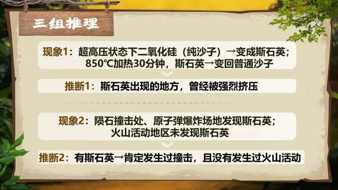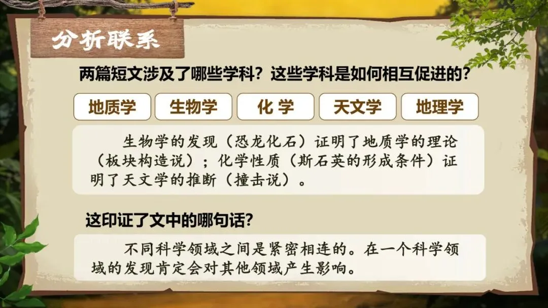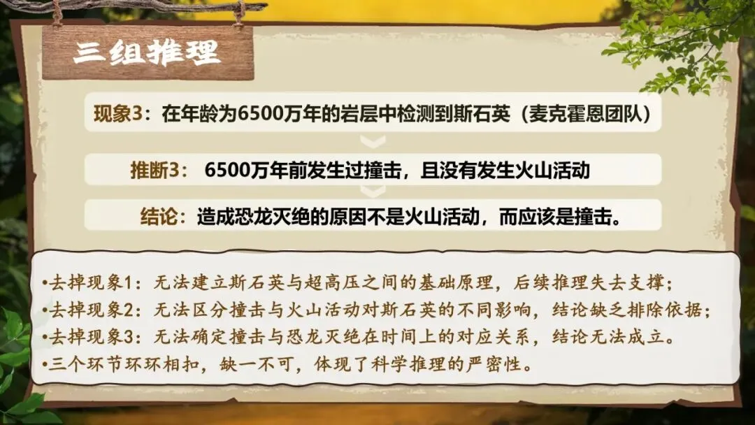 阐释道理 | 恐龙化石证明板块构造说 | 斯石英证明撞击说 | 均证明“不同科学领域紧密相连” |