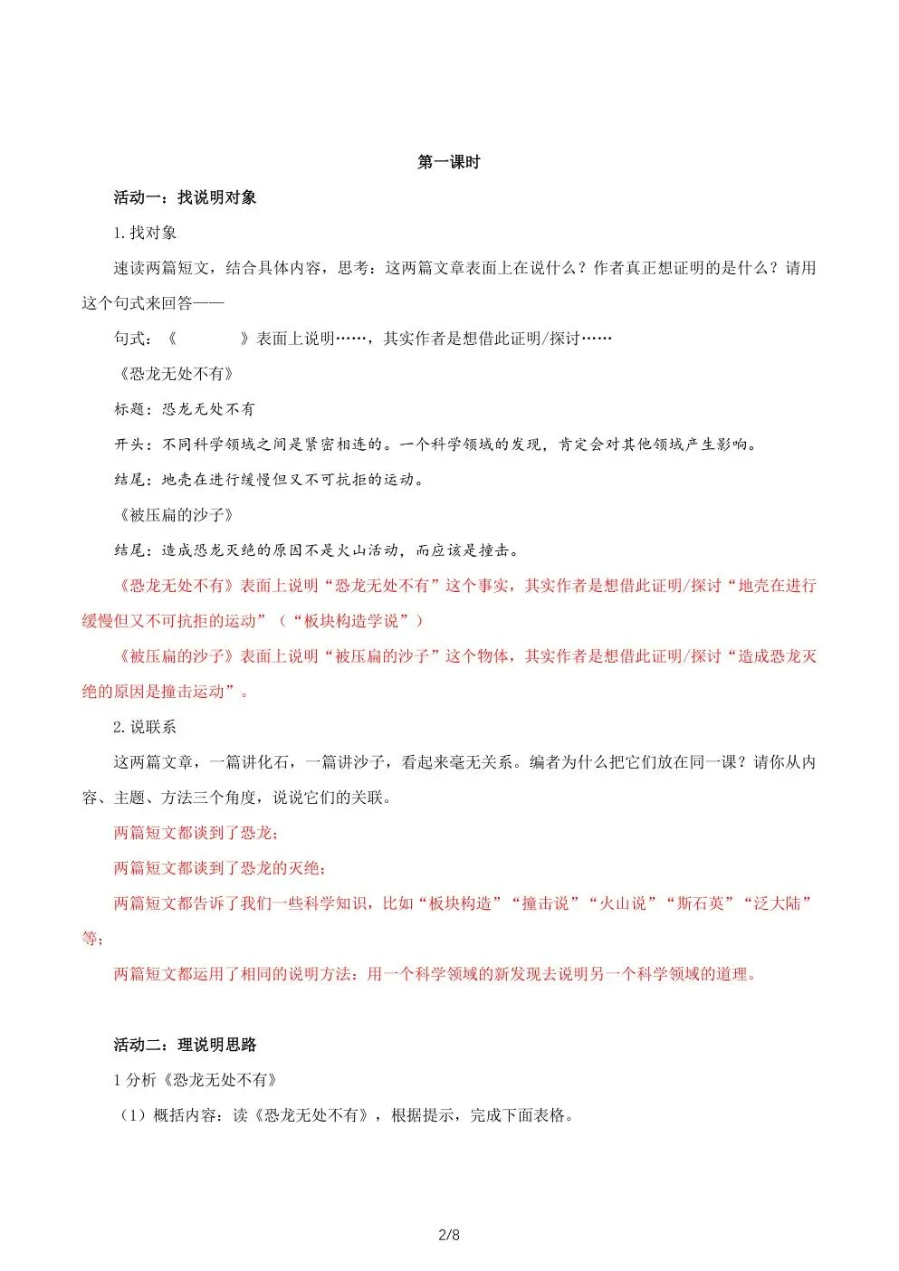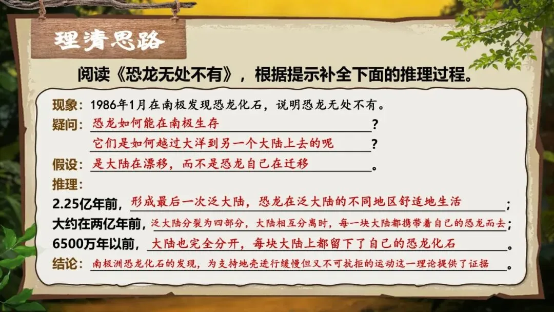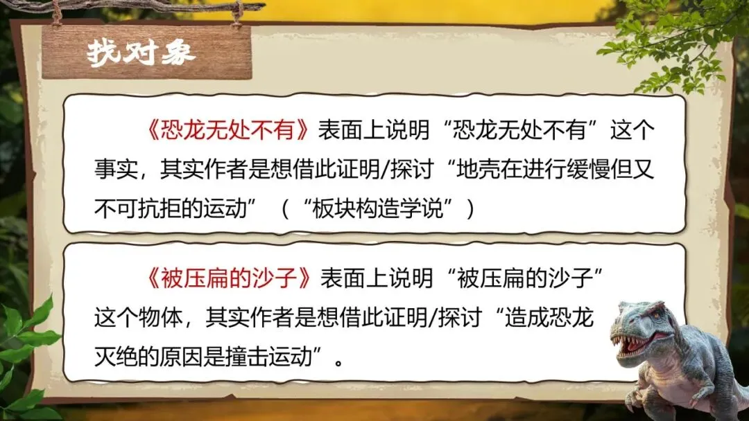 《恐龙无处不有》表面上说明“恐龙无处不有”这个事实,其实作者是想借此证明/探讨“地壳在进行缓慢但又不可抗拒的运动”(“板块构造学说”)