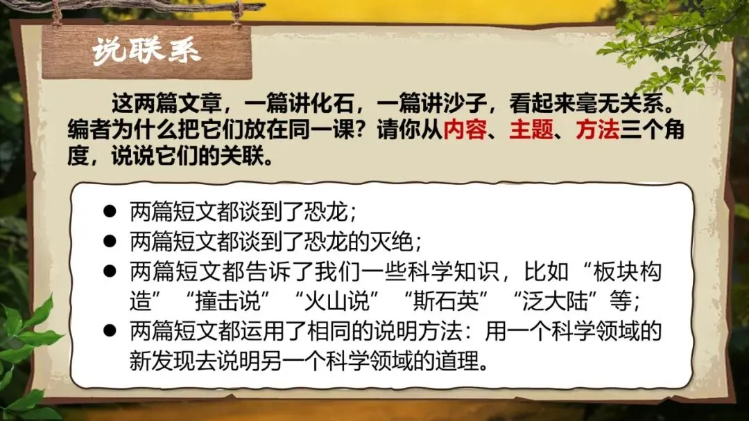 这两篇文章,一篇讲化石,一篇讲沙子,看起来毫无关系。编者为什么把它们放在同一课?请你从内容、主题、方法三个角度,说说它们的关联。