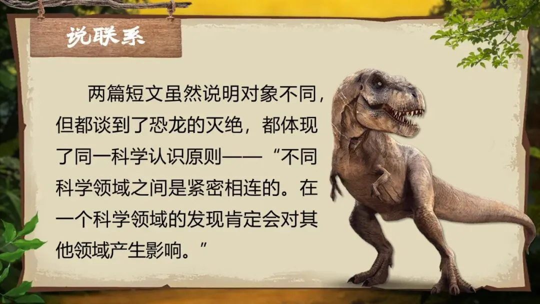 小结:两篇短文虽然说明对象不同,但都谈到了恐龙的灭绝,都体现了同一科学认识原则——“不同科学领域之间是紧密相连的。在一个科学领域的发现肯定会对其他领域产生影响。”