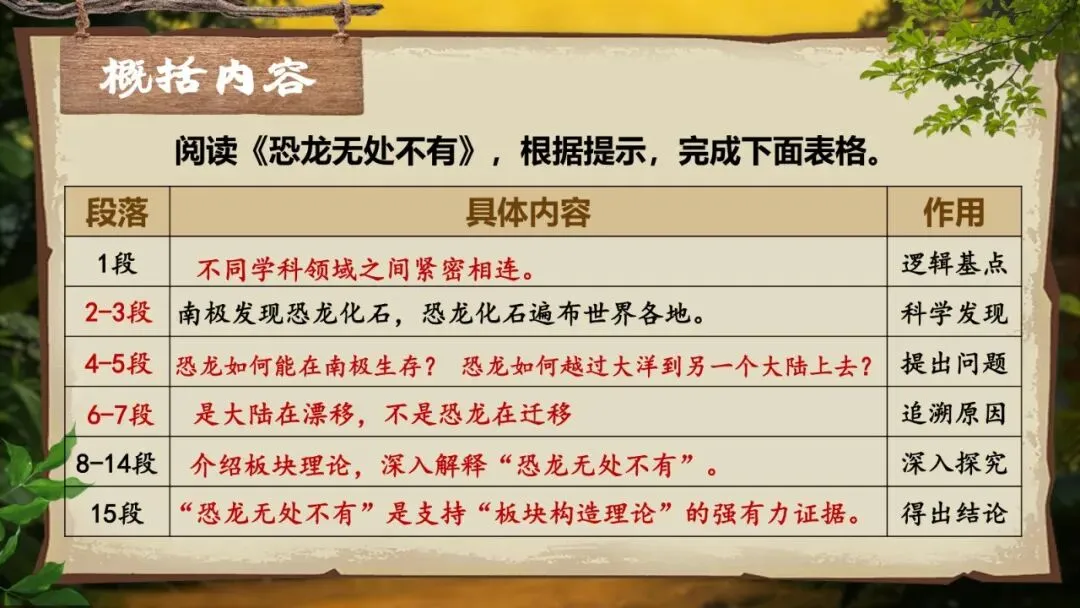 8-14段 | 介绍板块理论,深入解释“恐龙无处不有”。 | 深入探究 |