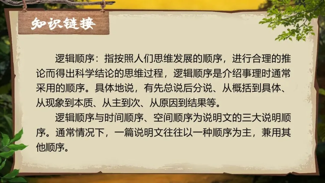 逻辑顺序与时间顺序、空间顺序为说明文的三大说明顺序。通常情况下,一篇说明文往往以一种顺序为主,兼用其他顺序。