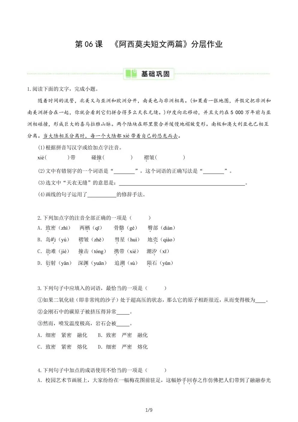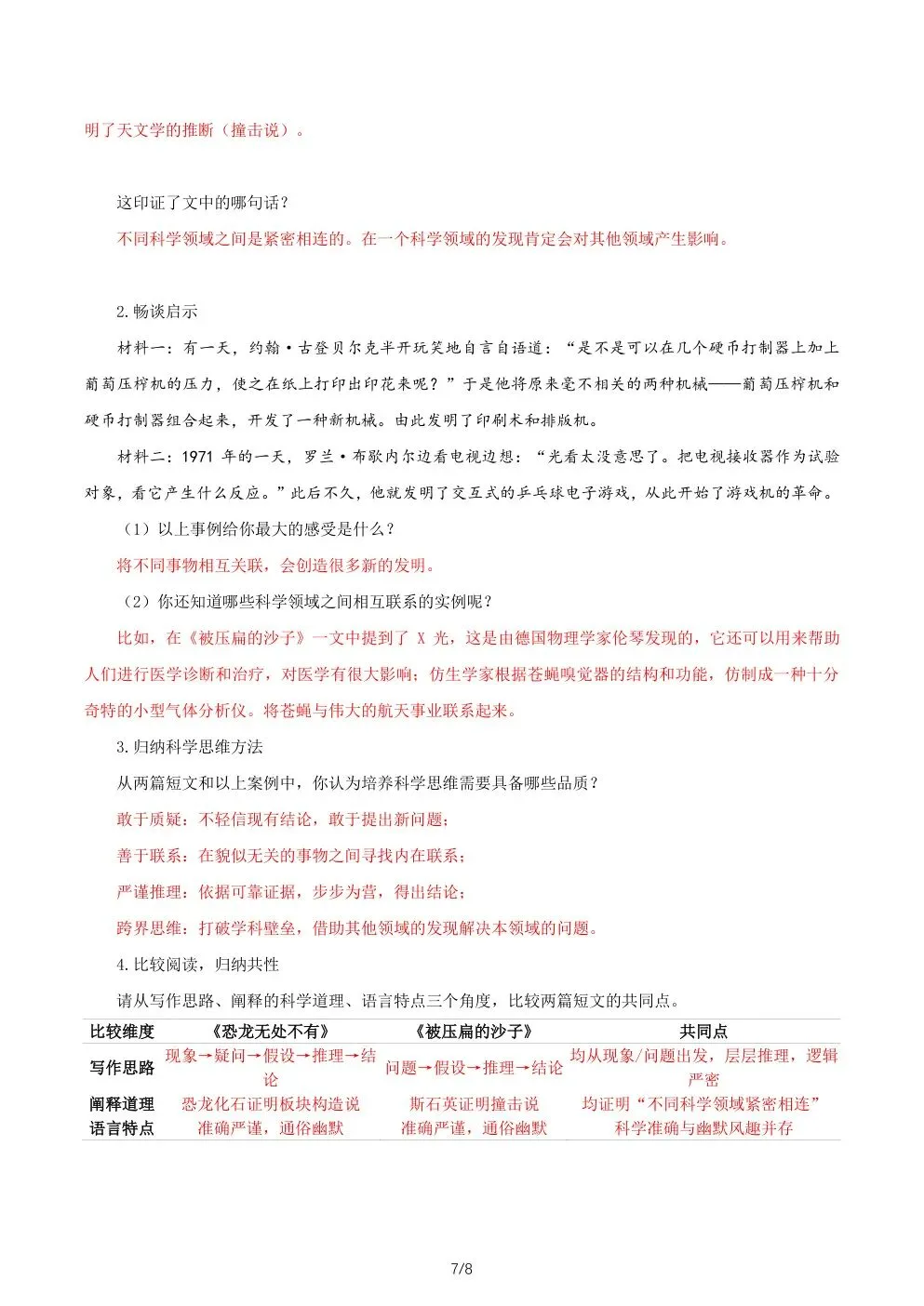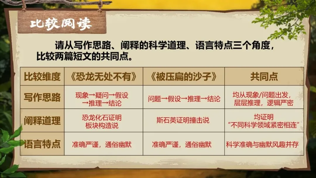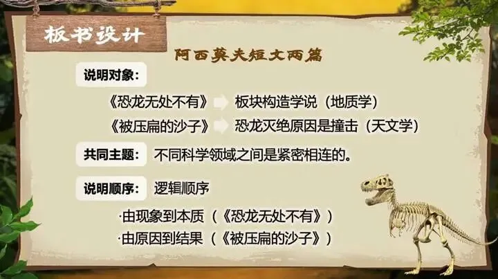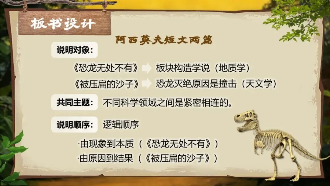 《恐龙无处不有》说明了板块构造理论,《被压扁的沙子》说明了恐龙灭绝的原因是撞击,它们共同验证了“不同科学领域之间是紧密联系的”这一观点。