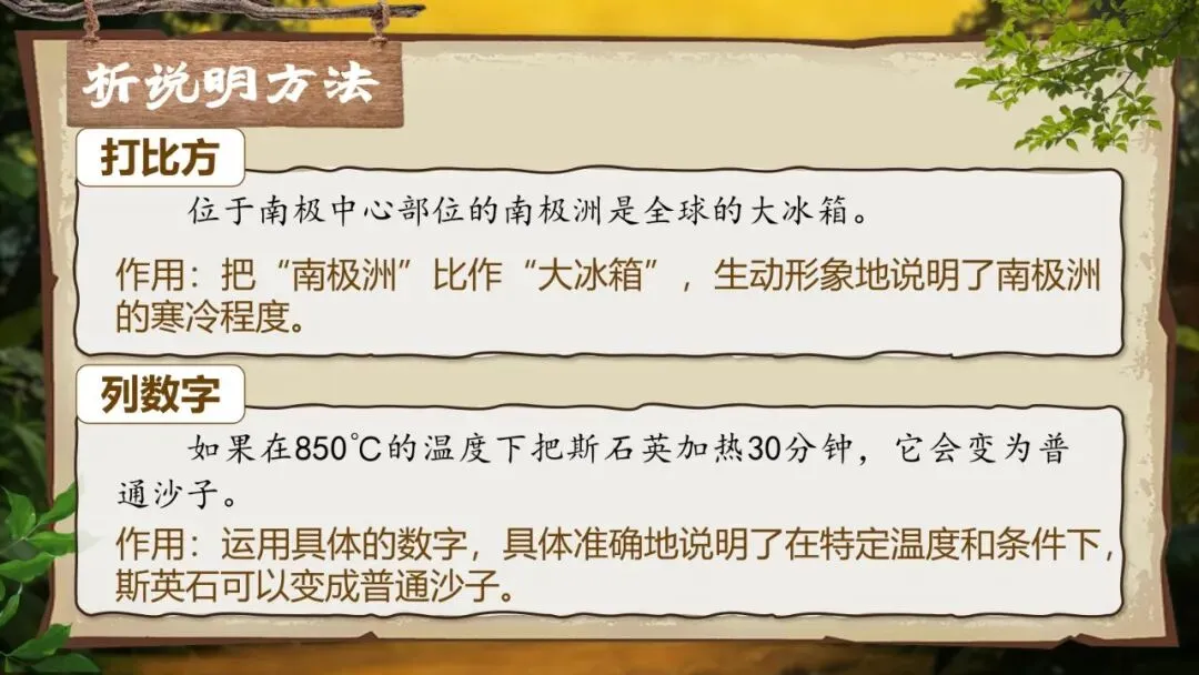 打比方 | 位于南极中心部位的南极洲是全球的大冰箱。 | 把“南极洲”比作“大冰箱”,生动形象地说明了南极洲的寒冷程度。 |