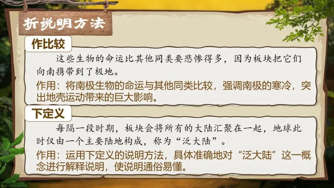 下定义 | 每隔一段时期,板块会将所有的大陆汇聚在一起,地球此时仅由一个主要陆地构成,称为“泛大陆”。 | 运用下定义的说明方法,具体准确地对“泛大陆”这一概念进行解释说明,使说明通俗易懂。 |