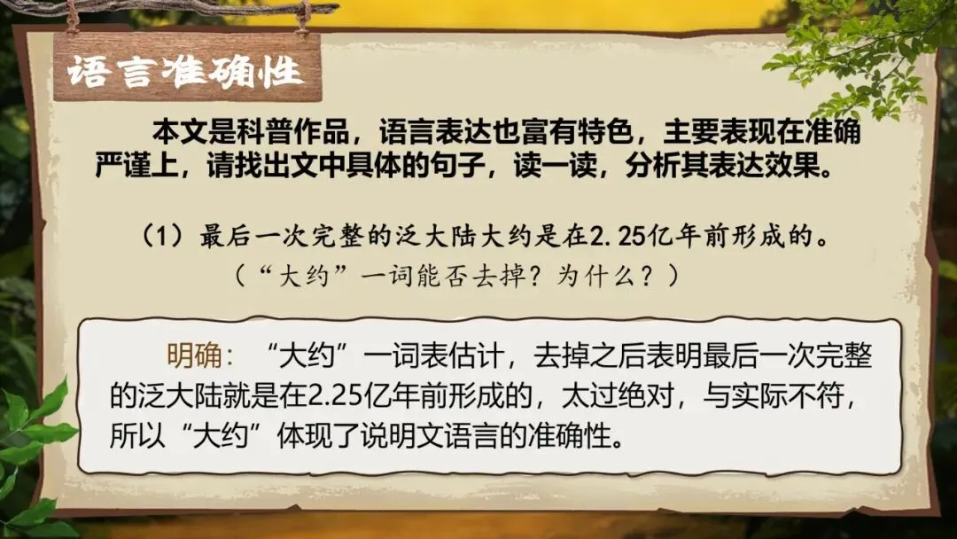 明确:“大约”一词表估计,去掉之后表明最后一次完整的泛大陆就是在2.25亿年前形成的,太过绝对,与实际不符,所以“大约”体现了说明文语言的准确性。