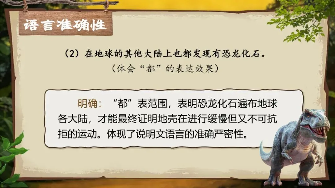 明确:“都”表范围,表明恐龙化石遍布地球各大陆,才能最终证明地壳在进行缓慢但又不可抗拒的运动。体现了说明文语言的准确严密性。