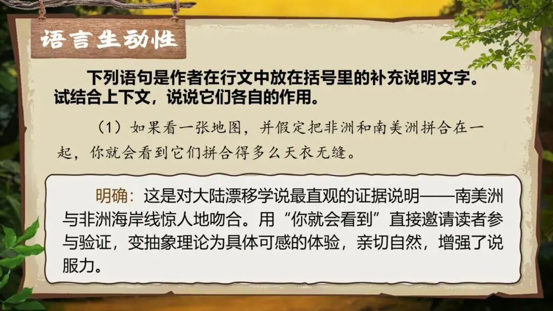 明确:这是对大陆漂移学说最直观的证据说明——南美洲与非洲海岸线惊人地吻合。用“你就会看到”直接邀请读者参与验证,变抽象理论为具体可感的体验,亲切自然,增强了说服力。