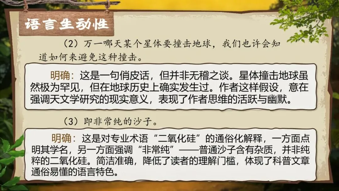 总结:这些补充说明的文字,化高深的科学概念为平易的介绍,化严密的科学论证为幽默诙谐的类比说明,充分体现了本文语言科学准确与通俗幽默并重的特色。