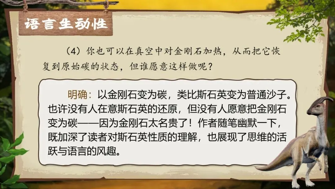 明确:以金刚石变为碳,类比斯石英变为普通沙子。也许没有人在意斯石英的还原,但没有人愿意把金刚石变为碳——因为金刚石太名贵了!作者随笔幽默一下,既加深了读者对斯石英性质的理解,也展现了思维的活跃与语言的风趣。