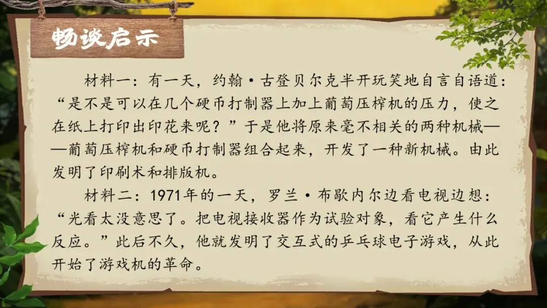 材料一:有一天,约翰·古登贝尔克半开玩笑地自言自语道:“是不是可以在几个硬币打制器上加上葡萄压榨机的压力,使之在纸上打印出印花来呢?”于是他将原来毫不相关的两种机械——葡萄压榨机和硬币打制器组合起来,开发了一种新机械。由此发明了印刷术和排版机。