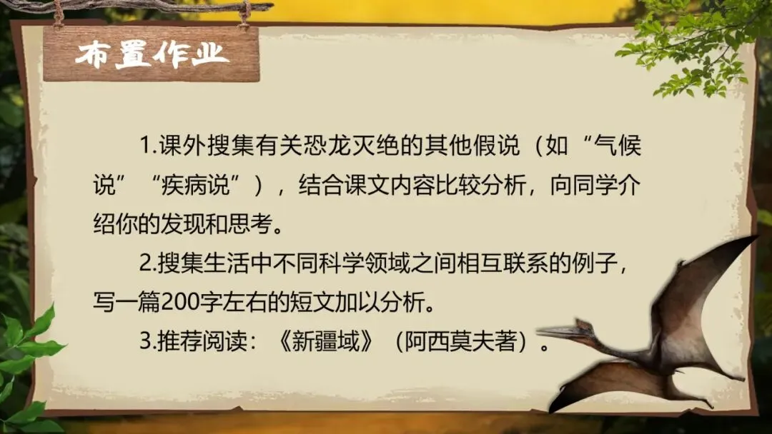 1.课外搜集有关恐龙灭绝的其他假说(如“气候说”“疾病说”),结合课文内容比较分析,向同学介绍你的发现和思考。