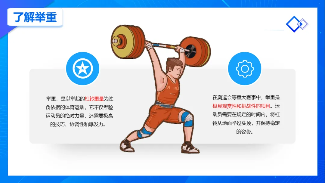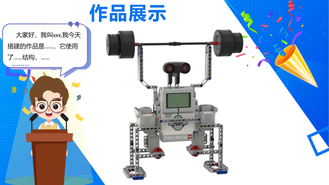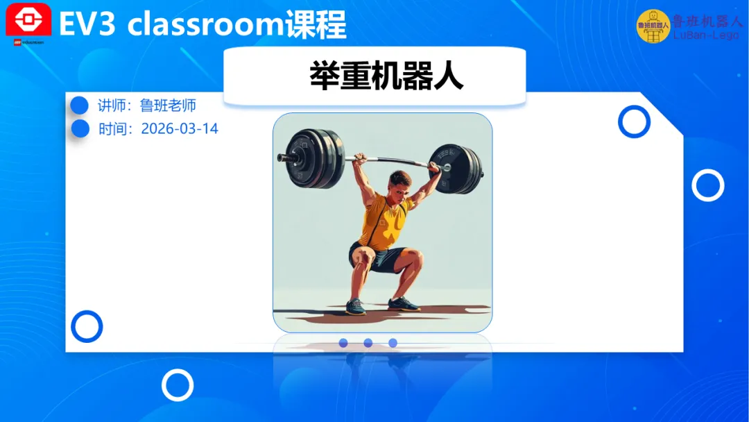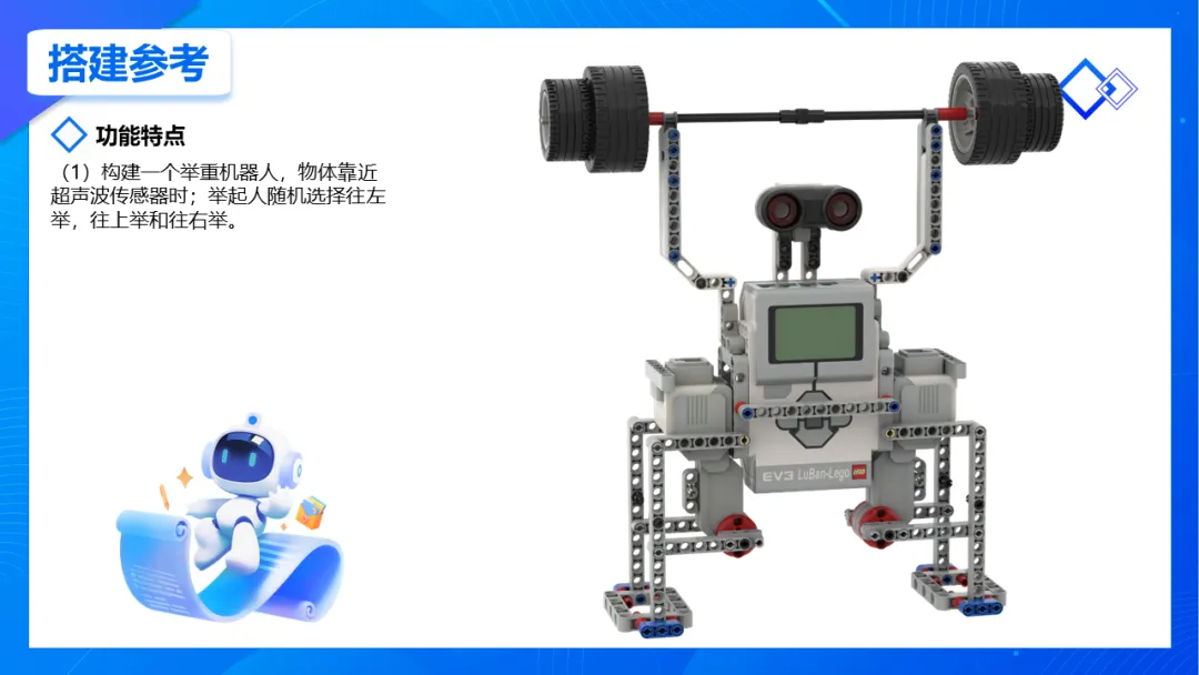 ①知识认知目标:了解举重运动的基本规则(抓举、挺举)及平行四边形的几何特性,理解其在 EV3 举重机器人机械结构中的应用原理。②实践操作目标:能够运用平行四边形变形特性搭建举重机器人的核心连杆结构,确保机器人 “举杠铃” 时身体保持水平稳定。③编程应用目标:掌握 EV3 编程逻辑,能编写包含超声波检测、随机数变量、电机条件控制的循环程序,实现机器人根据随机数完成不同模式的举重动作。导课视频:视频展示了举重比赛的精彩时刻(课件中包含原视频)。EV3举重机器人作品运行视频(课件中包含原视频)。课件包含详细编程讲解,提供新版与旧版程序源文件,这里只展示1页。课程总结,这部分内容主要是方便老师做课后反馈,发家长群使用,老师们请根据自己的需要做适当更改。尊敬的家长: